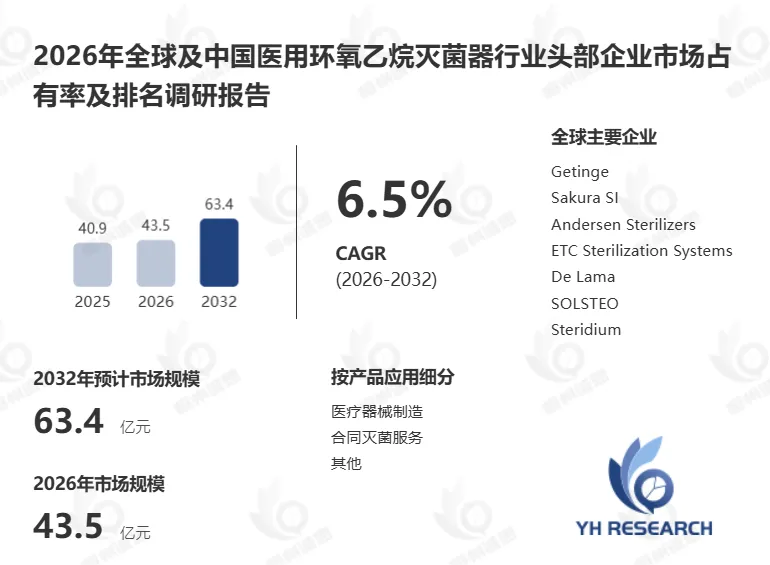 根据YH恒州诚思信息咨询调研统计,2025年全球医用环氧乙烷灭菌器市场规模约40.91亿元,预计未来将持续保持平稳增长的态势,到2032年市场规模将接近63.37亿元,未来六年CAGR为6.5%。
