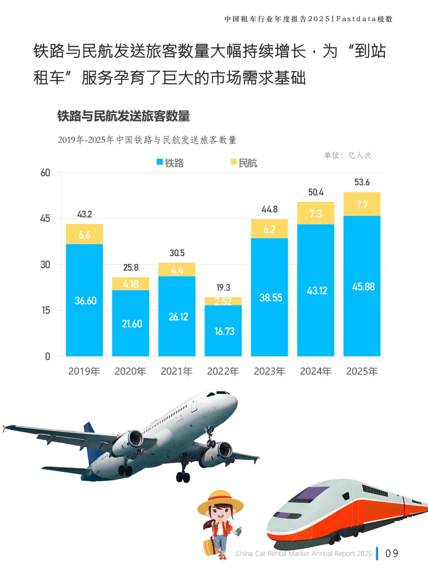 2025年中国租车行业实现强劲复苏,市场规模达1044亿元,同比增长24%,彻底走出疫情影响。国内旅游、铁路民航客流持续增长,有驾照无车人群达1.93亿人,为行业提供庞大潜在用户,租车逐步从出行工具升级为体验型消费。