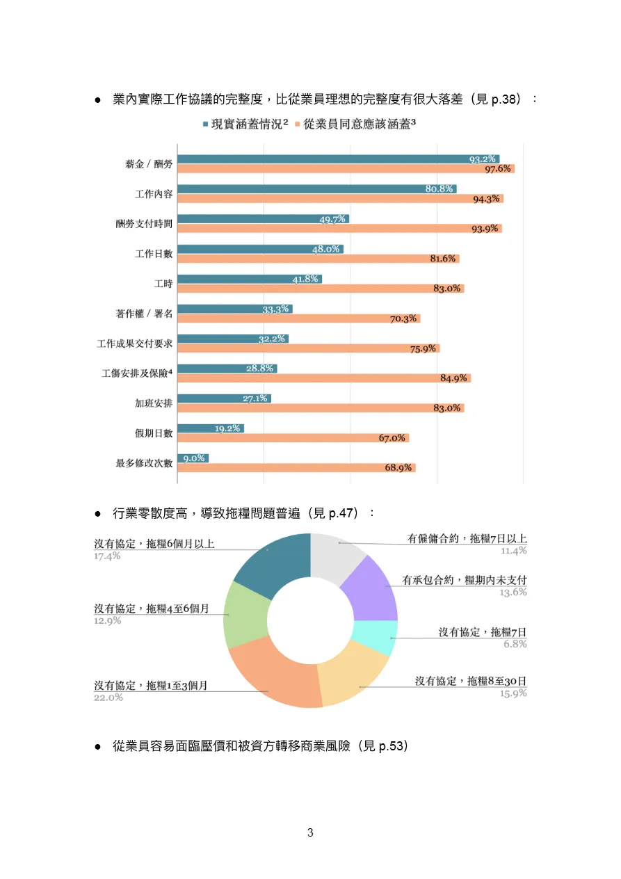 • 合约条款极度不完整:现实中仅33.3%协议涵盖著作权,27.1%明确加班安排,28.8%包含工伤保险,远低于从业员理想中的70.3%、83.0%与84.9%,信息不对称使自由职业者处于绝对劣势。