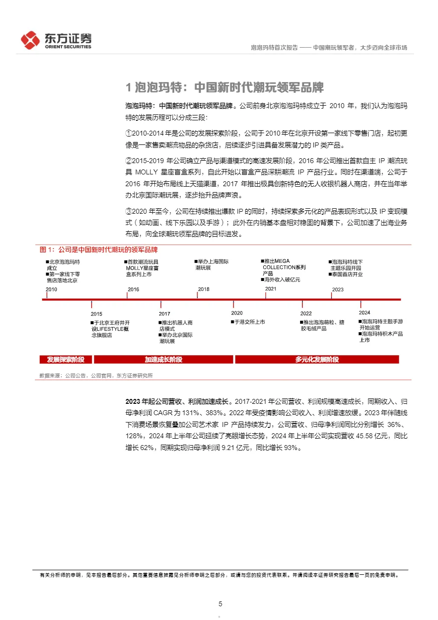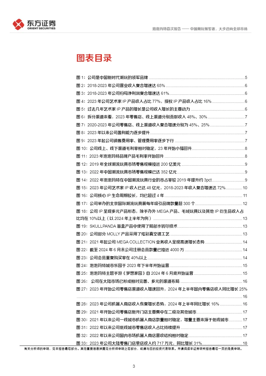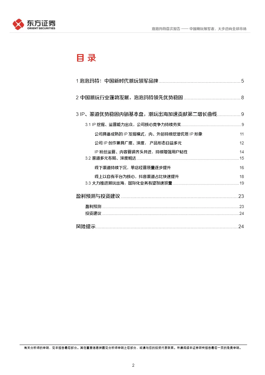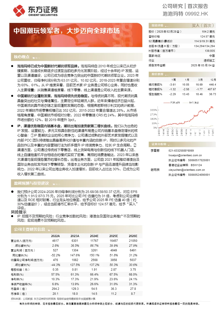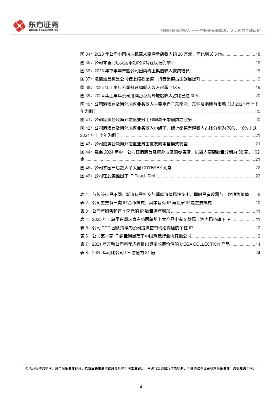 • 出海进入爆发期,零售模式替代批发:2024年上半年港澳台及海外收入占比达30%,毛利率高于国内。通过“本土化IP共创”(如泰国CRYBABY、北美Peach Riot)+“核心商圈直营店”模式,快速建立品牌认知,海外线下渠道贡献70%收入,成为第二增长曲线。