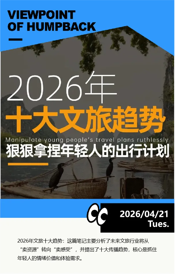 2026年文旅十大趋势:这篇笔记主要分析了未来文旅行业将从“卖资源”转向“卖感受”,并提出了十大传播趋势,核心是抓住年轻人的情绪价值和体验需求。