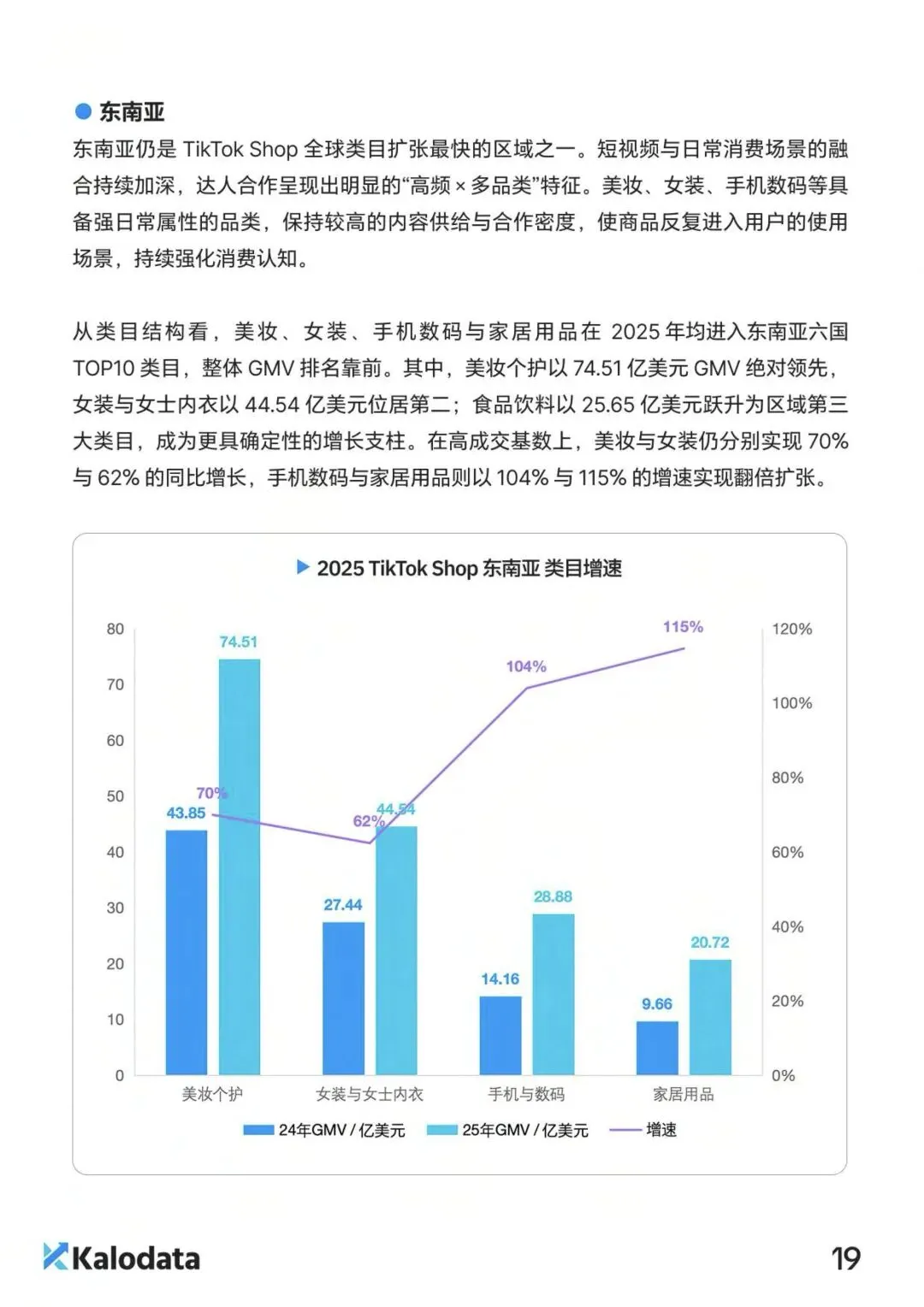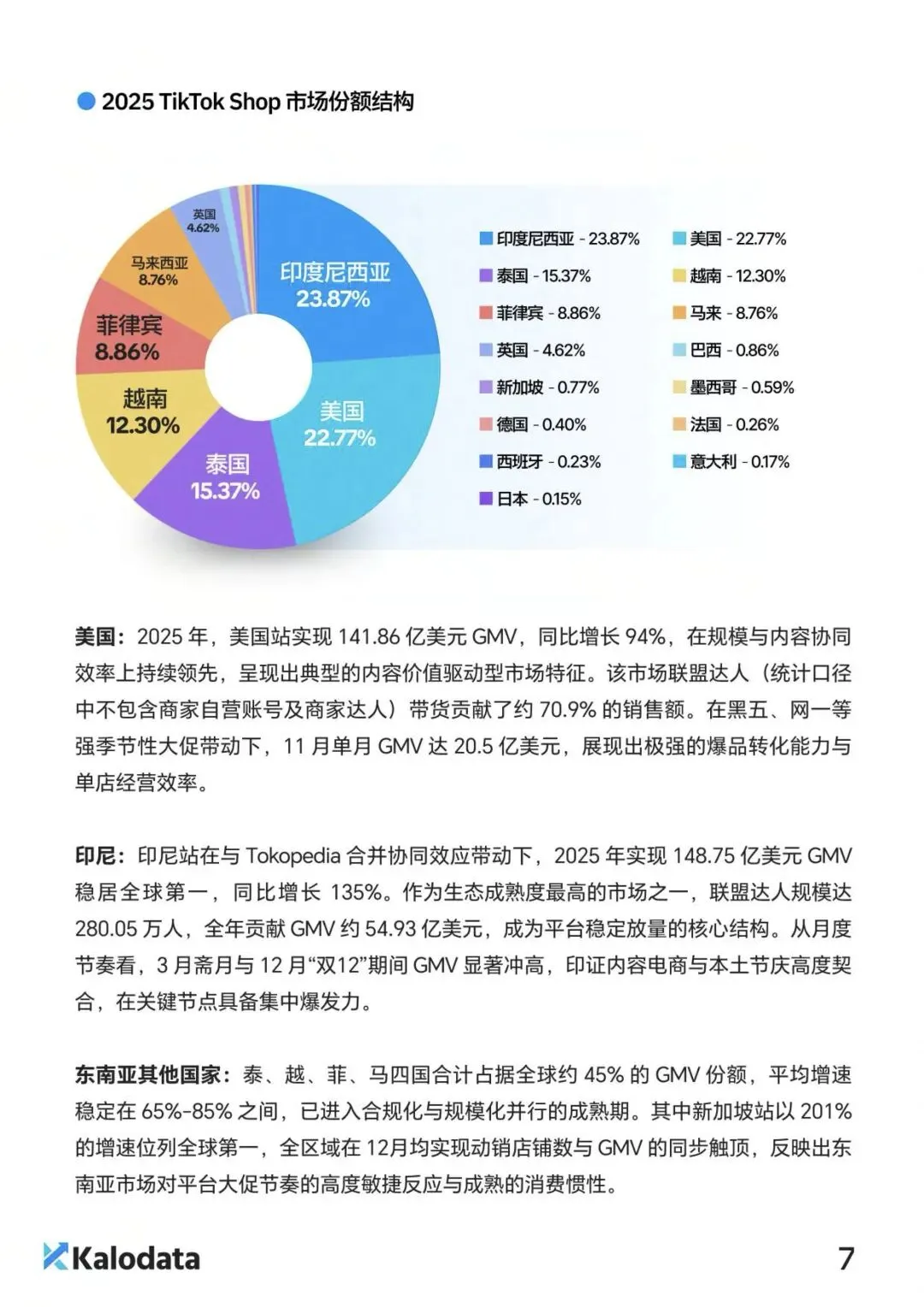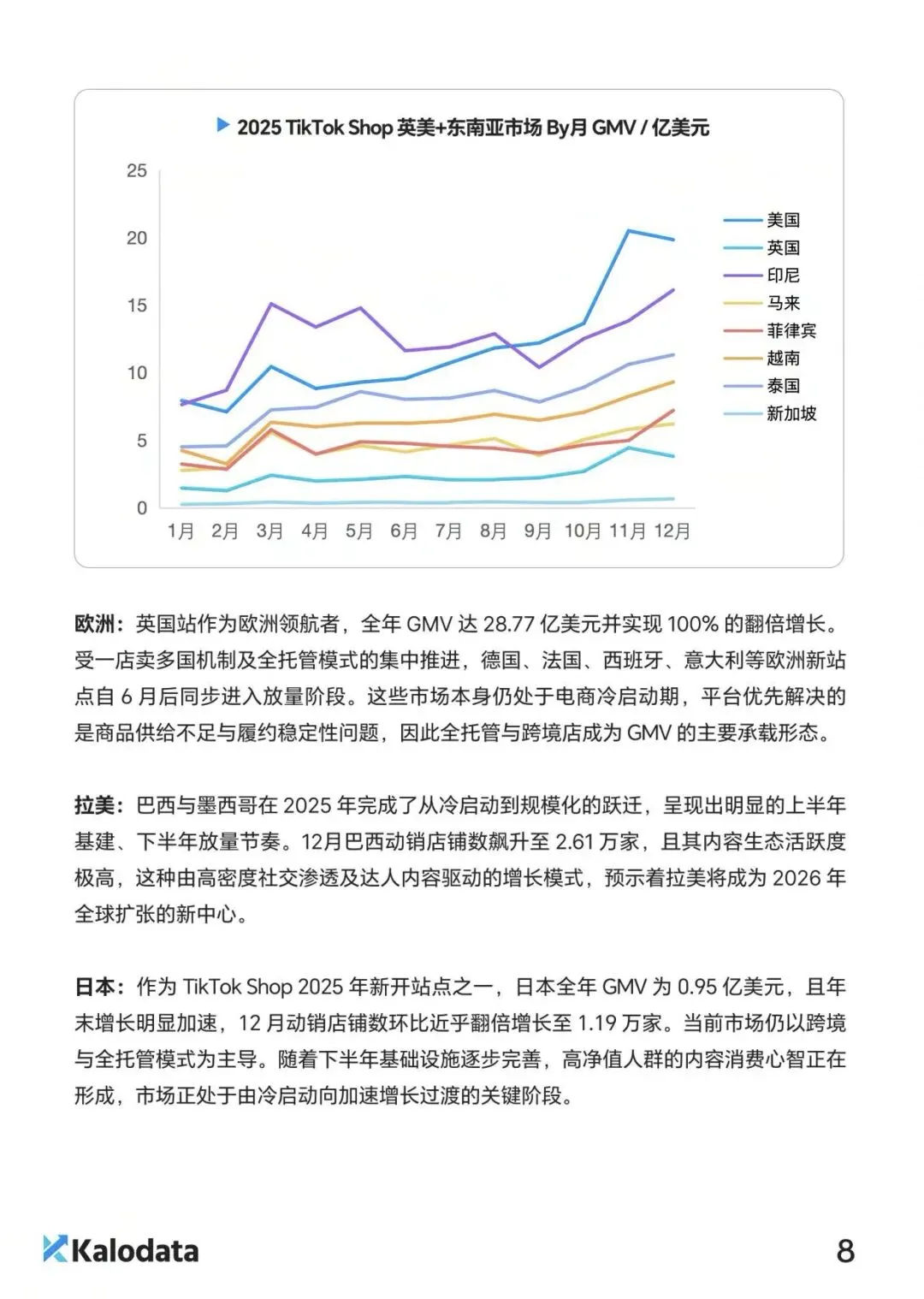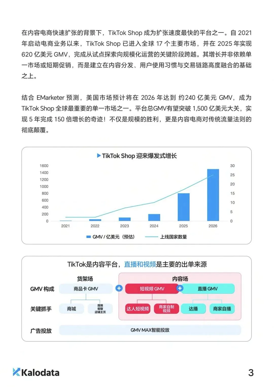 Kalodata 报告指出,2025 年 TikTok 电商 GMV 达 623 亿美元,同比增 95.5%,进入全球爆发期。东南亚为基本盘,美国风险解除高增,欧洲、日本、拉美新市场开放。内容为核心引擎,短视频主导成交,2026 年 GMV 有望破 1500 亿美元,本地化、供应链、达人运营成决胜关键。