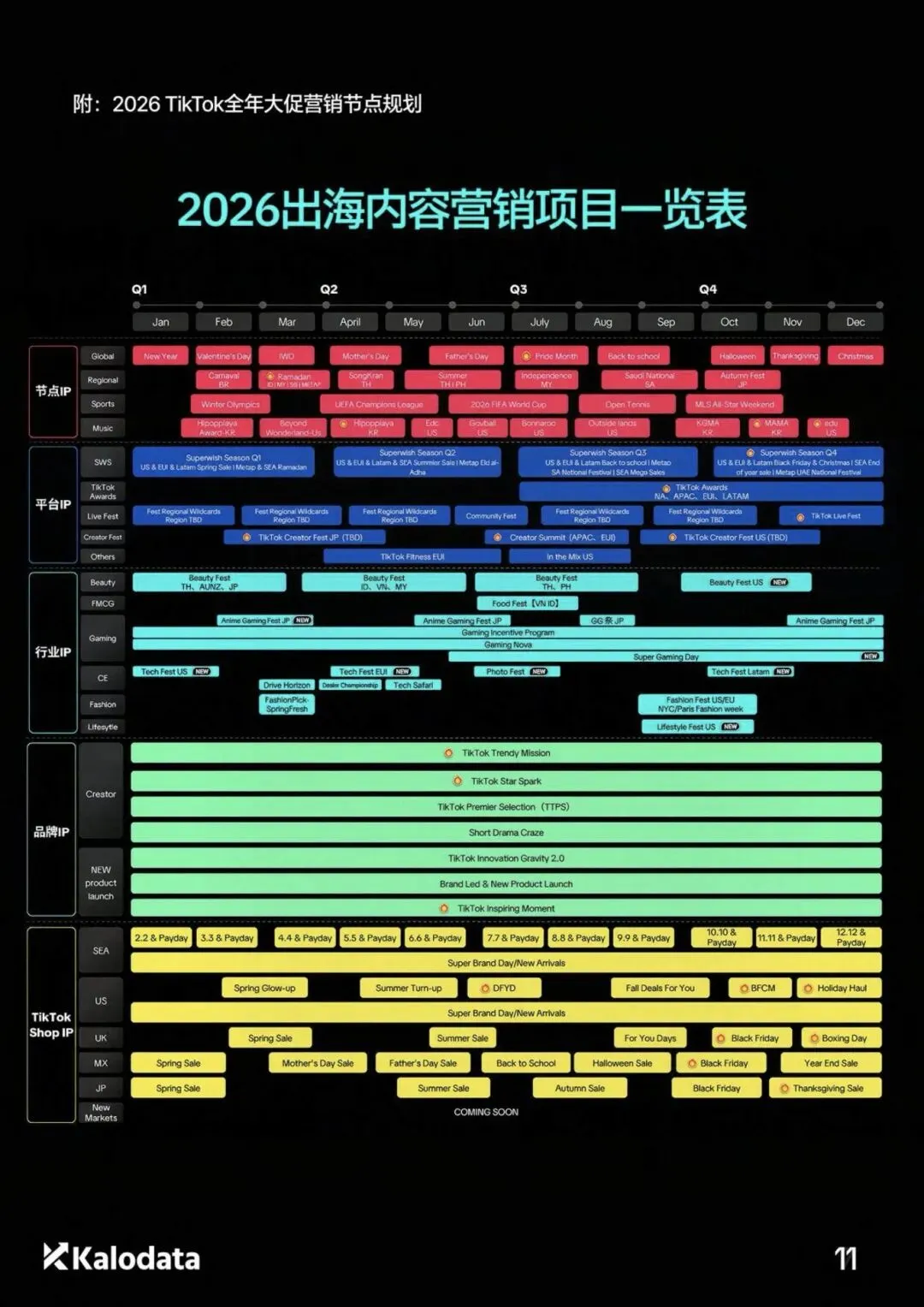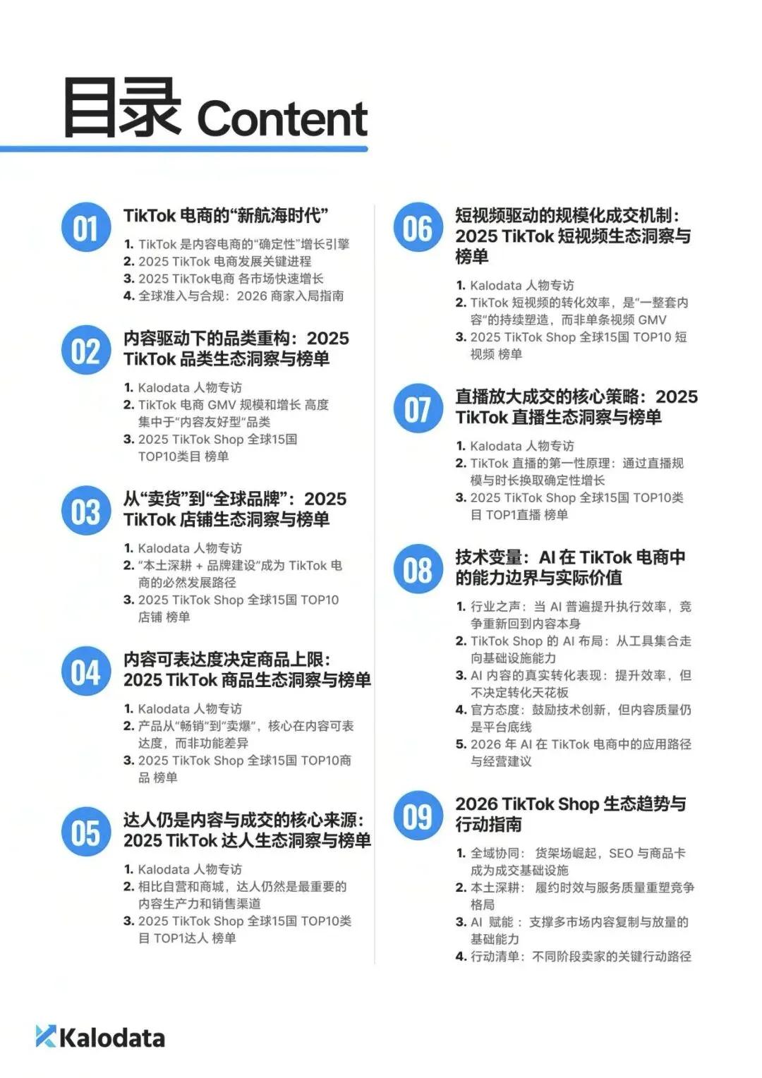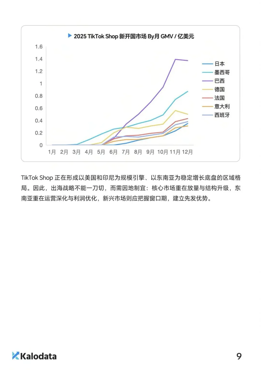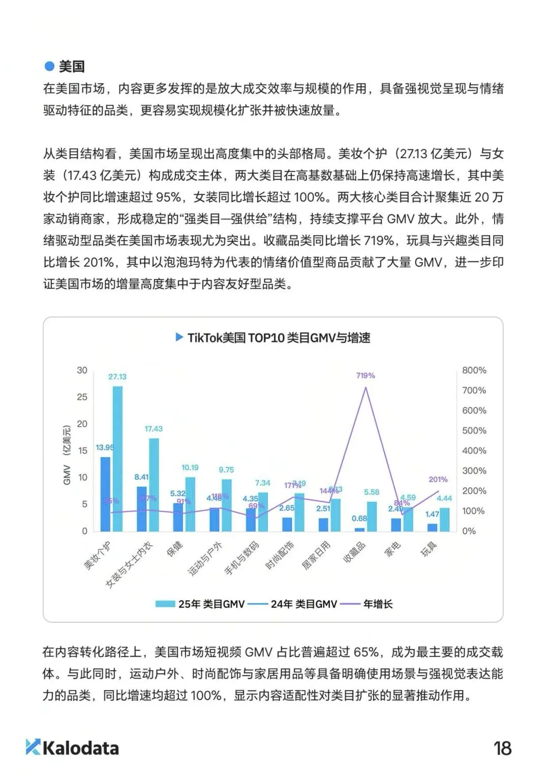 Kalodata 报告指出,2025 年 TikTok 电商 GMV 达 623 亿美元,同比增 95.5%,进入全球爆发期。东南亚为基本盘,美国风险解除高增,欧洲、日本、拉美新市场开放。内容为核心引擎,短视频主导成交,2026 年 GMV 有望破 1500 亿美元,本地化、供应链、达人运营成决胜关键。