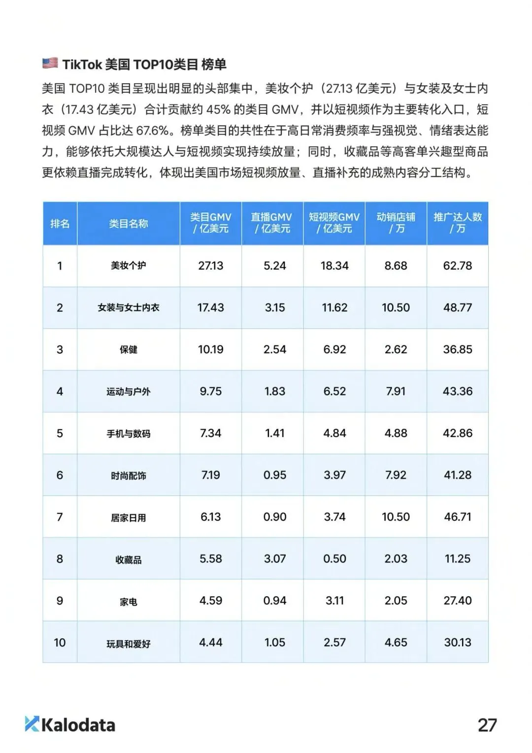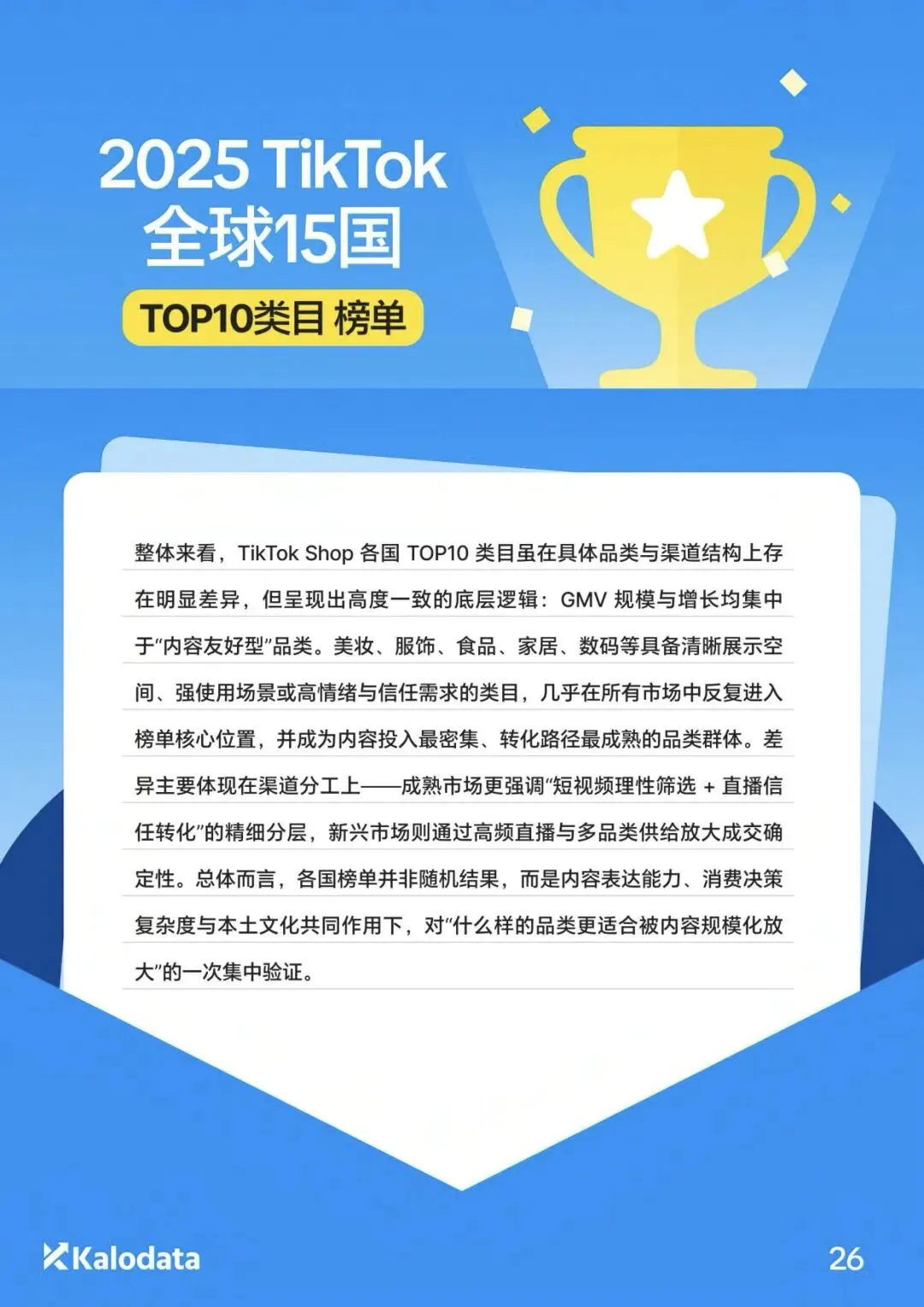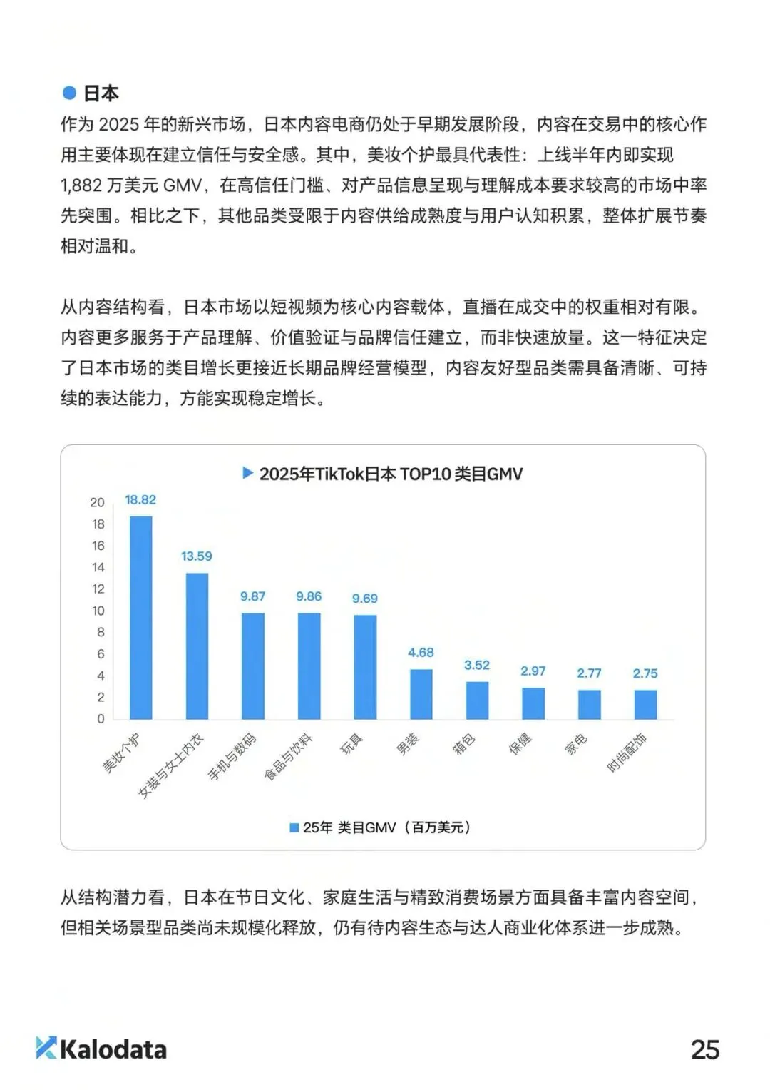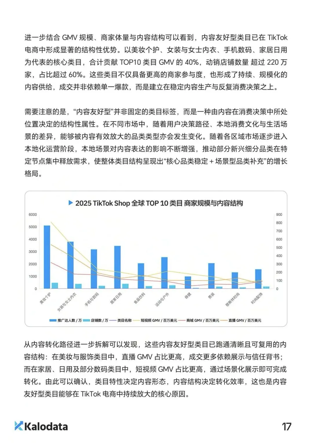 全球进入爆发周期,市场格局清晰分化。2025 年进入 17 国,GMV 623 亿美元,2026 年望破 1500 亿。东南亚稳固基本盘,印尼、泰国、越南、马来、菲律宾前五;美国风险解除,2026 年预估 240 亿美元;欧洲英法德意稳步起量,巴西、墨西哥为拉美增长核心,日本处于冷启动后期。 内容驱动交易,短视频为核心出单渠道。GMV 以内容场为主,短视频贡献高于直播,货架场占比较低。算法与 GMV MAX 强化内容转化,黑五大促验证规模化能力。达人内容稀缺、效率高,冷启动成本低,成为新市场破局首选,美国等市场直播尚未爆发,2026 年或迎拐点。 品类向内容友好型集中,美妆、女装、数码领跑。全球 TOP10 类目 GMV 集中美妆个护、女装、手机数码,合计占 35.2%。时尚配饰、家居用品增速超 130%,高内容表现力、高决策信任、高频复购品类更适配。不同市场品类结构差异,本地化选品与内容决定爆款持续性。 模式以全托管与跨境为主,新市场优先供应链稳定。欧洲、拉美、日本以全托管、跨境 POP 承载,解决供给与履约问题。东南亚卖家与达人成熟,头部商家精细化直播间运营,达人数据化选品。平台推进 “一店卖多国”,降低入驻门槛,提升供给丰富度。 2026 年三大关键趋势:美国直播爆发、拉美规模化、本地化成标配。美国直播电商迎质变,东南亚全面超越 Shopee;巴西、墨西哥成为最快增长新市场;本地化从可选项变核心能力,物流、清关、合规、达人、内容深度本土,中国品牌出海需落地运营与资源整合。