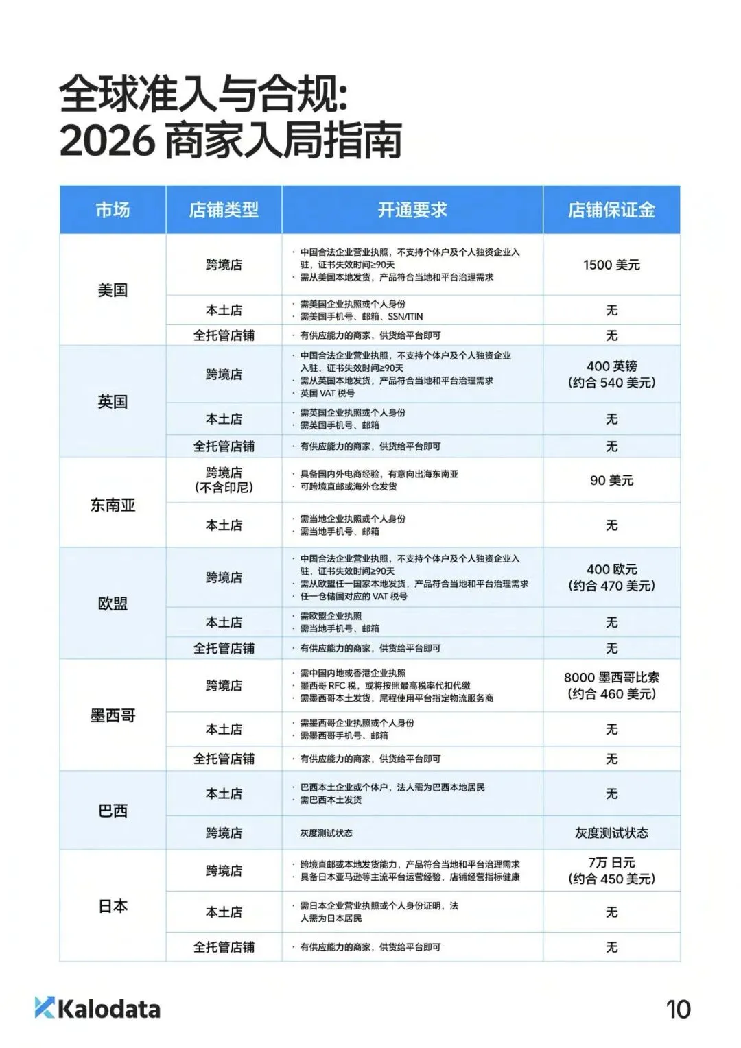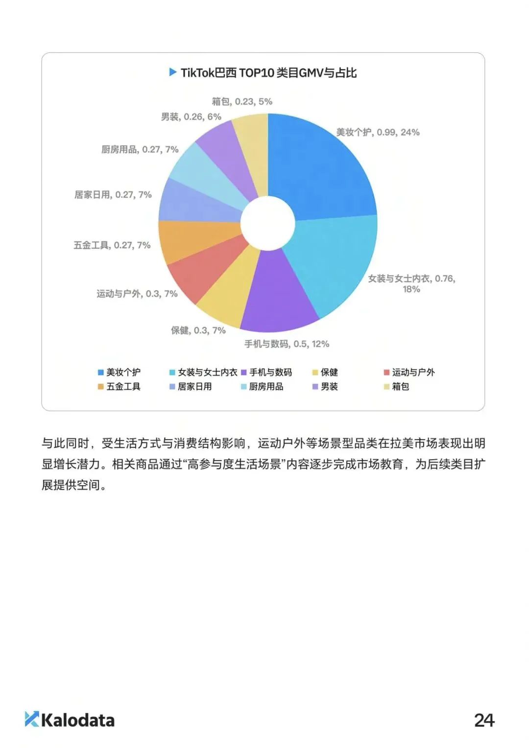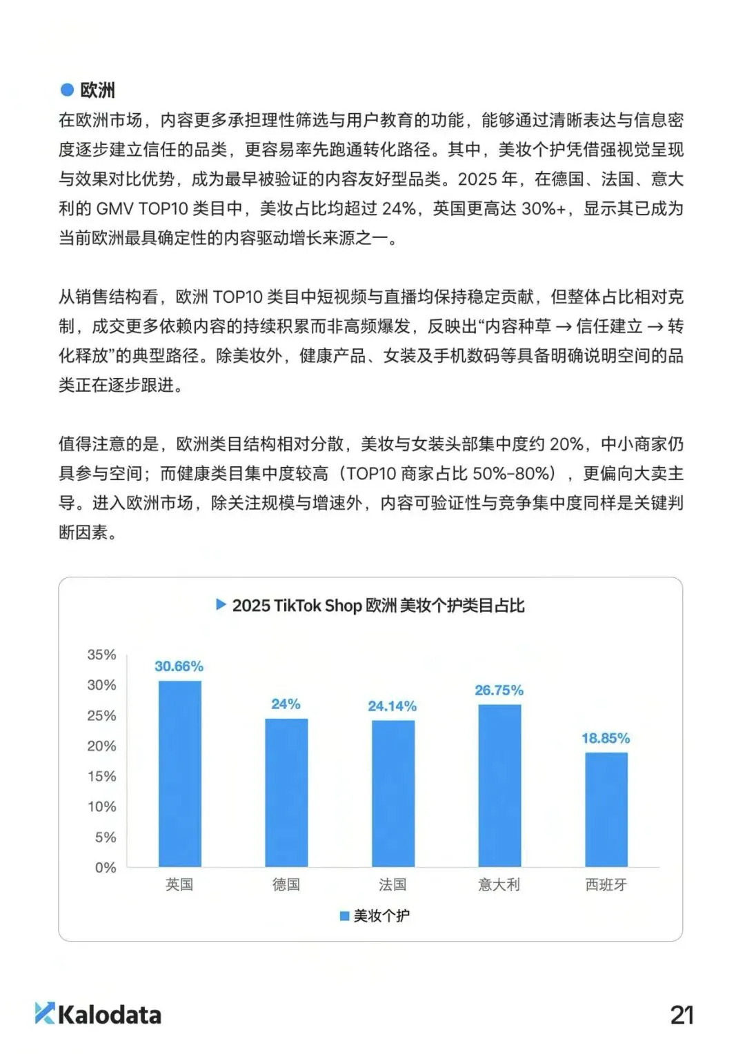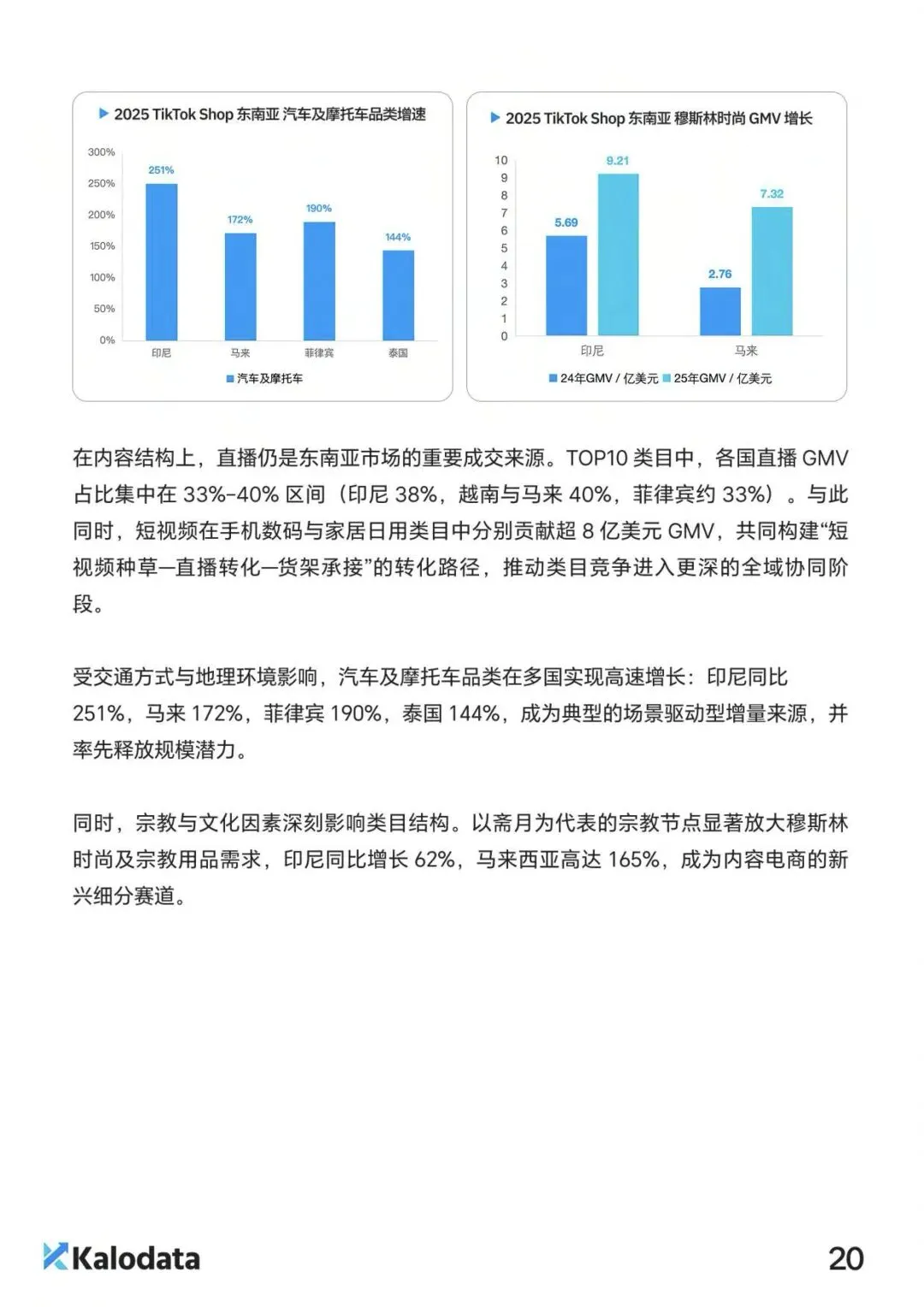 全球进入爆发周期,市场格局清晰分化。2025 年进入 17 国,GMV 623 亿美元,2026 年望破 1500 亿。东南亚稳固基本盘,印尼、泰国、越南、马来、菲律宾前五;美国风险解除,2026 年预估 240 亿美元;欧洲英法德意稳步起量,巴西、墨西哥为拉美增长核心,日本处于冷启动后期。 内容驱动交易,短视频为核心出单渠道。GMV 以内容场为主,短视频贡献高于直播,货架场占比较低。算法与 GMV MAX 强化内容转化,黑五大促验证规模化能力。达人内容稀缺、效率高,冷启动成本低,成为新市场破局首选,美国等市场直播尚未爆发,2026 年或迎拐点。 品类向内容友好型集中,美妆、女装、数码领跑。全球 TOP10 类目 GMV 集中美妆个护、女装、手机数码,合计占 35.2%。时尚配饰、家居用品增速超 130%,高内容表现力、高决策信任、高频复购品类更适配。不同市场品类结构差异,本地化选品与内容决定爆款持续性。 模式以全托管与跨境为主,新市场优先供应链稳定。欧洲、拉美、日本以全托管、跨境 POP 承载,解决供给与履约问题。东南亚卖家与达人成熟,头部商家精细化直播间运营,达人数据化选品。平台推进 “一店卖多国”,降低入驻门槛,提升供给丰富度。 2026 年三大关键趋势:美国直播爆发、拉美规模化、本地化成标配。美国直播电商迎质变,东南亚全面超越 Shopee;巴西、墨西哥成为最快增长新市场;本地化从可选项变核心能力,物流、清关、合规、达人、内容深度本土,中国品牌出海需落地运营与资源整合。