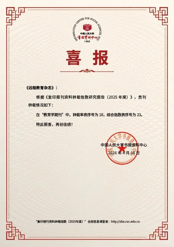 4月18日,中国人民大学书报资料中心发布了《复印报刊资料转载指数研究报告(2025年度)》,《远程教育杂志》在评选中再获佳绩。在“教育学期刊”中,我刊转载率排名第18位,综合指数排名第23位。