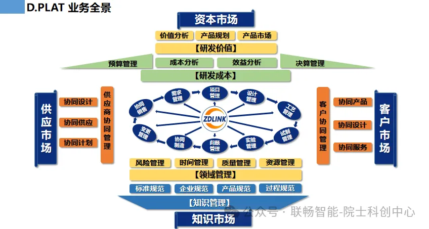 “资本市场”聚焦“研发价值”与“研发成本”。“研发价值” 通过 “价值分析”“产品规划”“产品市场”来挖掘,旨在明确产品的市场价值,做好产品规划以推向市场;“研发成本”依靠“成本分析”“效益分析”以及“预算管理”“决算管理” 进行管控,确保研发投入与产出平衡,为企业在资本市场的表现提供支持。