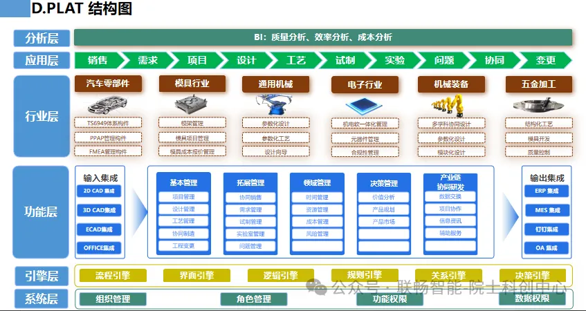 聚焦业务集成与管理,输入集成对接3D CAD、CAE等工具;核心模块涵盖技术、流程、案例、实验、产品管理;输出集成对接ERP、MES等外部系统,实现数据互联互通。