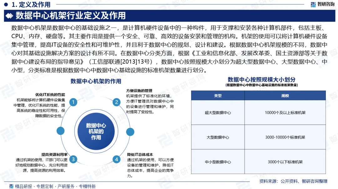 行业定义及作用:数据中心机架是数据中心的基础设施之一,是计算机硬件设备中的一种构件,用于支撑和安装各种计算机部件,包括主板、CPU、内存、硬盘等。其主要作用是提供一个安全、可靠、高效的设备安装和管理的机构。机架的使用可以将计算机硬件设备集中管理,提高IT设备的安全性和可维护性,并且利于数据中心的规划、设计和建设。