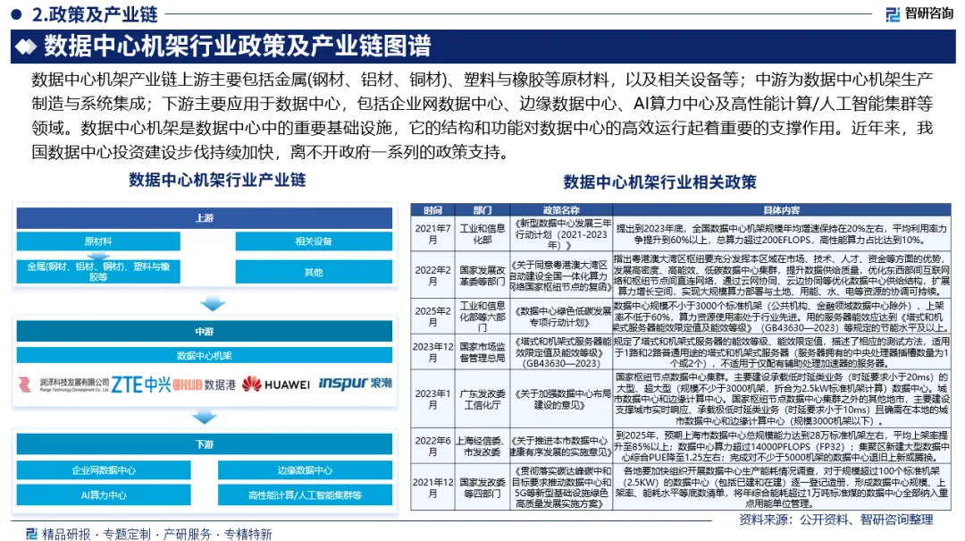 产业链核心节点:数据中心机架行业产业链上游主要包括金属(钢材、铝材、铜材)、塑料与橡胶等原材料,以及相关设备等;行业中游为数据中心机架生产制造与系统集成;行业下游主要应用于数据中心,包括企业网数据中心、边缘数据中心、AI算力中心及高性能计算/人工智能集群等领域。