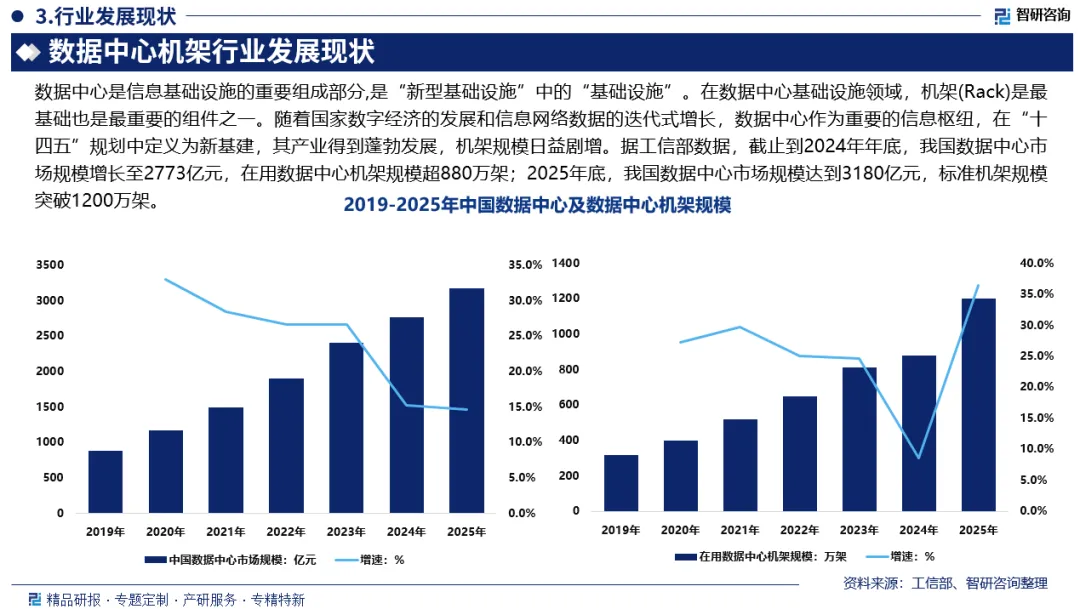 数据中心机架是数据中心的基础设施之一,它的使用可以将计算机硬件设备集中管理,提高IT设备的安全性和可维护性,并且利于数据中心的规划、设计和建设。数据中心是信息基础设施的重要组成部分,是“新型基础设施”中的“基础设施”。随着国家数字经济的发展和信息网络数据的迭代式增长,数据中心作为重要的信息枢纽,在“十四五”规划中定义为新基建,其产业得到蓬勃发展,机架规模日益剧增。据工信部数据,截止到2024年年底,我国数据中心市场规模增长至2773亿元,在用数据中心机架规模超880万架;2025年底,我国数据中心市场规模达到3180亿元,标准机架规模突破1200万架。