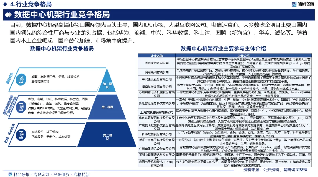 竞争情况:目前,国内数据中心机架高端市场由国际领先巨头主导,国内IDC市场、大型互联网公司、电信运营商、大多数政企项目主要由国内国内领先的综合性厂商与专业龙头占据,包括华为、浪潮、中兴、科华数据、科士达、图腾(新海宜)、华美、诚亿等。随着国内本土企业崛起,国产替代加速,数据中心机架市场集中度提升。