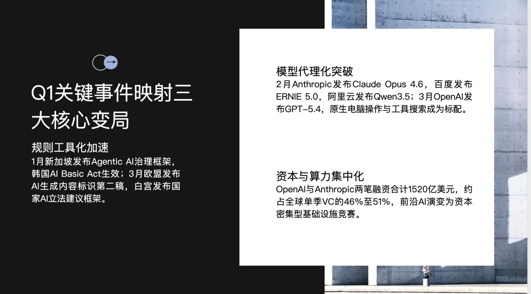 GPT‑5.4、Claude Opus 4.6、Qwen3.5、ERNIE 5.0等代表产品都在朝更长上下文、更强工具调用、更强多模态与更高推理效率演进;其中,电脑操作、工具搜索、原生多模态和稀疏MoE是Q1最清晰的四条技术主线。 - 应用价值已开始外溢到高价值流程。