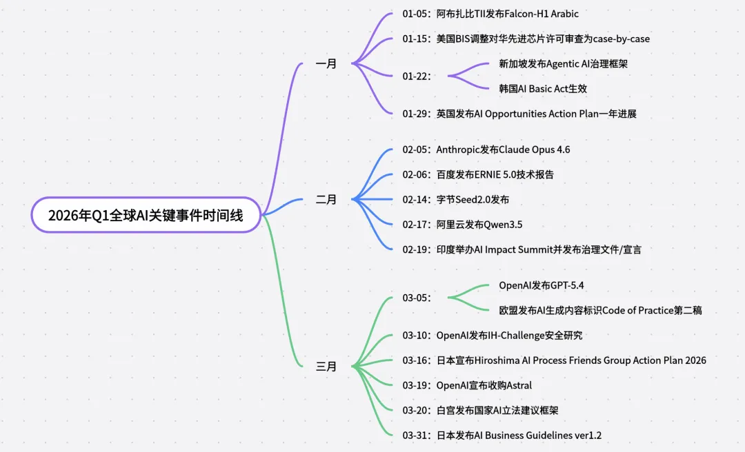 上图中的事件,基本对应了Q1最重要的三类变化:规则工具化、模型代理化、资本与算力基础设施集中化。 其中最值得高管注意的是,3月开始的事件密度明显上升,说明全球AI竞争正在从“探索期”转向“政策、产品、资本同步推进期”。