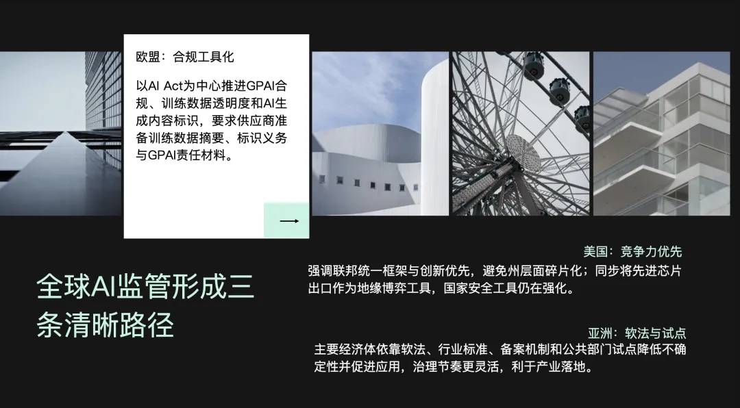Q1的政策与监管并未朝一个单一全球模式收敛,而是形成了三种清晰路径。欧盟继续以AI Act为中心推进GPAI合规、训练数据透明度和AI生成内容标识;美国强调联邦统一框架与创新优先,同时把先进芯片出口继续作为地缘博弈工具;亚洲则更多依靠软法、行业标准、备案机制和公共部门试点来降低不确定性并促进应用。