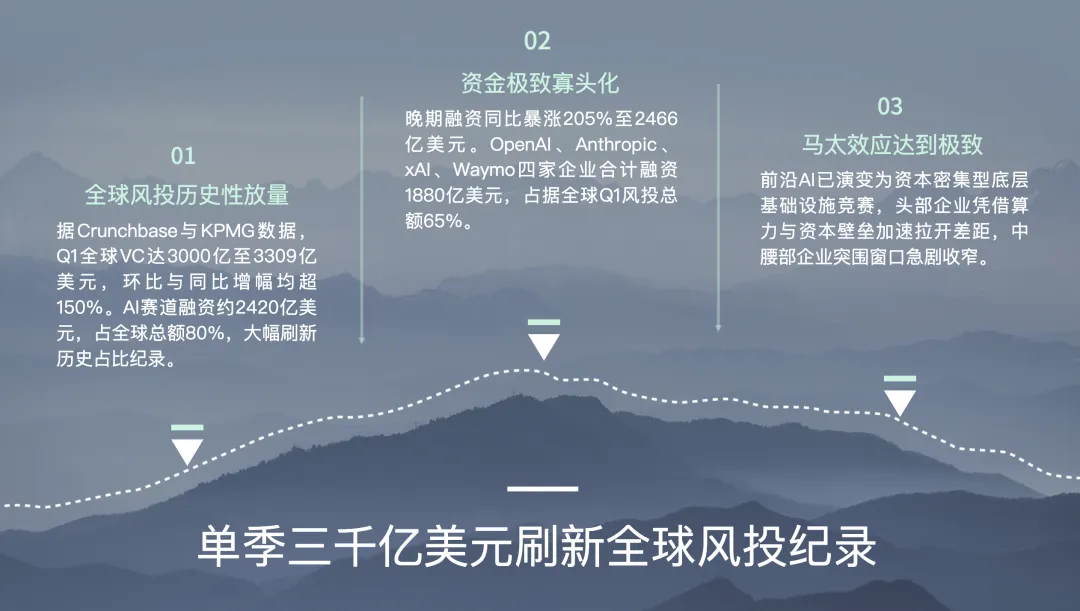 Q1 2026的产业主题不是“谁发布了更多模型”,而是谁拿到了更多资金、更多算力、更多企业工作流入口。按Crunchbase,Q1全球初创融资达到3000亿美元;按KPMG则达到3309亿美元。两家机构口径不同,但结论一致:AI是绝对主导变量,而且资金高度集中在极少数基础模型和算力平台。