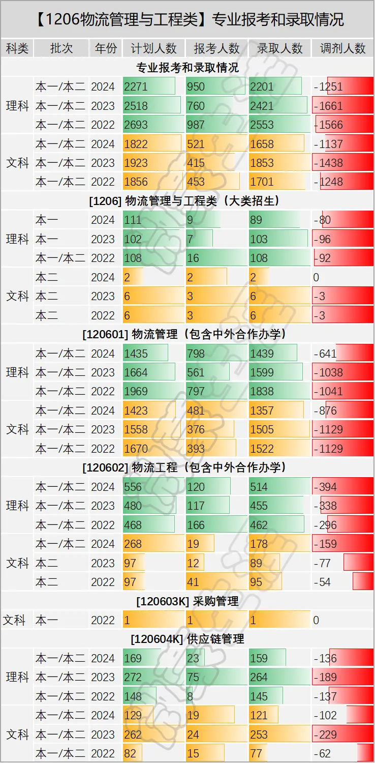物流管理:调剂-1129人、-1129人、-876人,持续为负,2024年缺876人,是最大洼地。