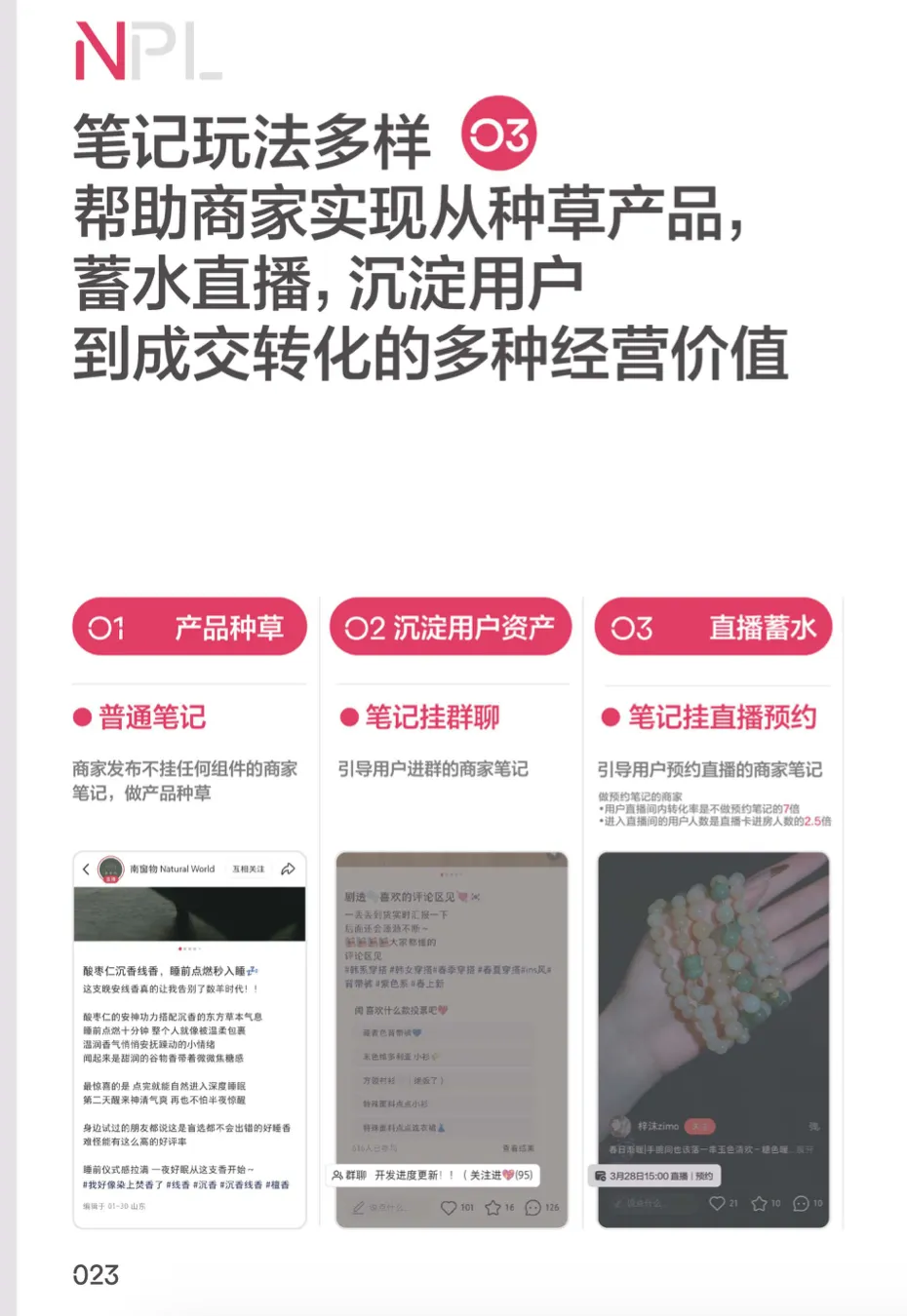 #NPL 不是简单的线性关系,是用户被笔记种草,关注商家进入群聊,建立信任并在直播间成交,收到好产品并分享出去,所形成的NPL正向循环。通过NPL的相互串联强化,让商家实现更稳定的#电商经营。
