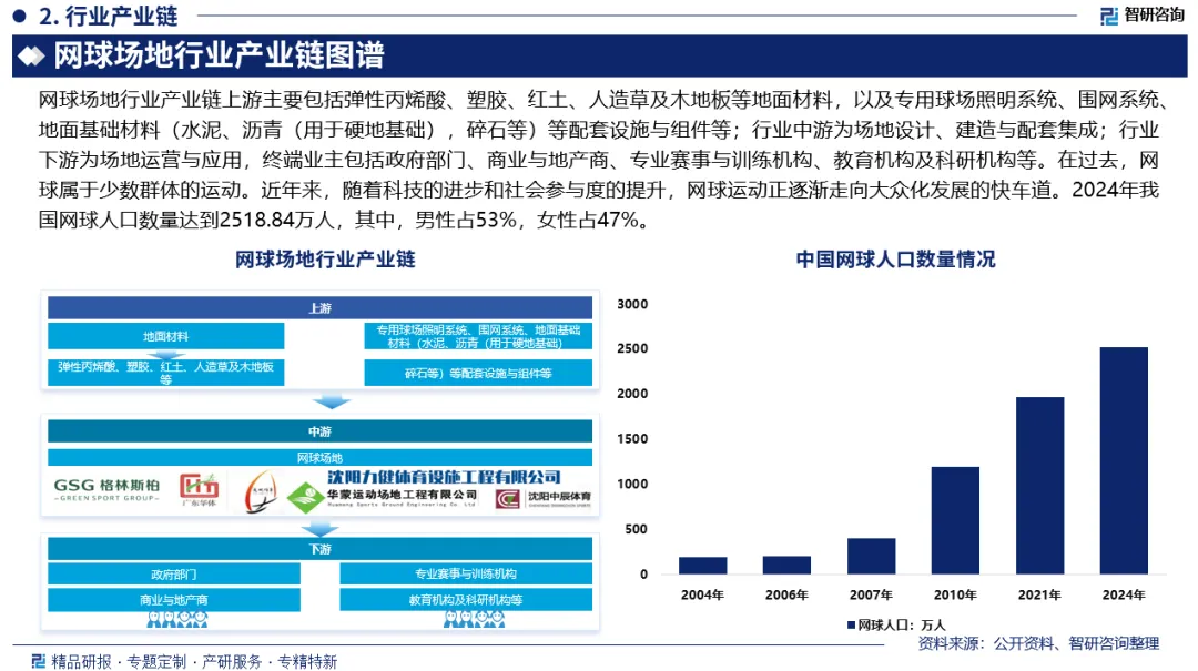 产业链核心节点:网球场地行业产业链上游主要包括弹性丙烯酸、塑胶、红土、人造草及木地板等地面材料,以及专用球场照明系统、围网系统、地面基础材料等配套设施与组件等;行业中游为场地设计、建造与配套集成;行业下游为场地运营与应用,终端业主包括政府部门、商业与地产商、专业赛事与训练机构及教育机构及科研机构等。