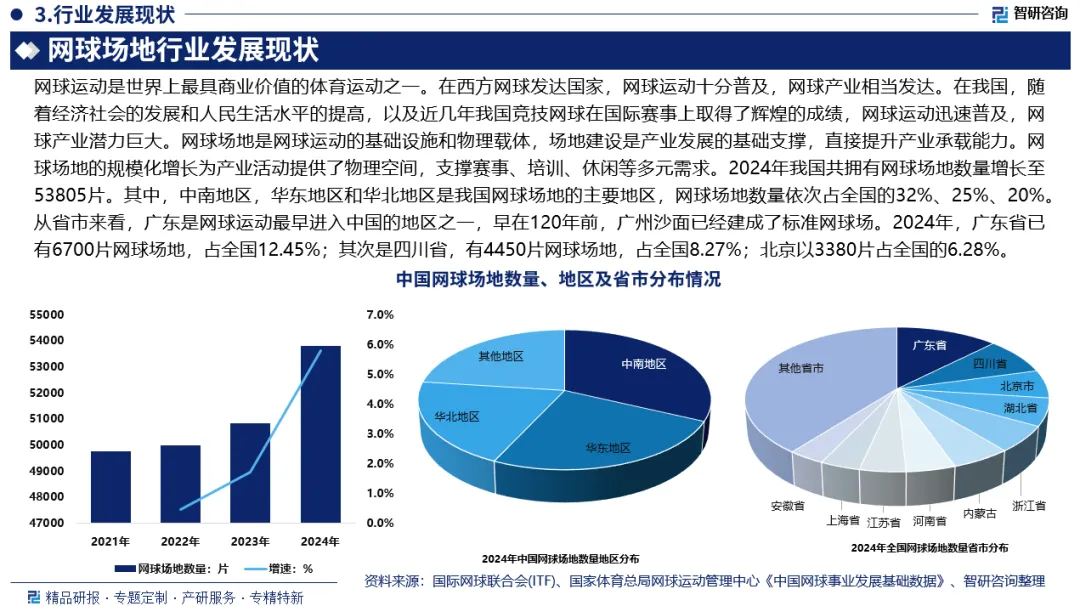 网球场地是进行网球运动的专业场地。网球运动是世界上最具商业价值的体育运动之一。在西方网球发达国家,网球运动十分普及,网球产业相当发达。在我国,随着经济社会的发展和人民生活水平的提高,以及近几年我国竞技网球在国际赛事上取得了辉煌的成绩,网球运动迅速普及,网球产业潜力巨大。网球场地是网球运动的基础设施和物理载体,场地建设是产业发展的基础支撑,直接提升产业承载能力。网球场地的规模化增长为产业活动提供了物理空间,支撑赛事、培训、休闲等多元需求。2024年我国共拥有网球场地数量增长至53805片。其中,中南地区,华东地区和华北地区是我国网球场地的主要地区,网球场地数量依次占全国的32%、25%、20%。从省市来看,广东是网球运动最早进入中国的地区之一,早在120年前,广州沙面已经建成了标准网球场。2024年,广东省已有6700片网球场地,占全国12.45%;其次是四川省,有4450片网球场地,占全国8.27%;北京以3380片占全国的6.28%。