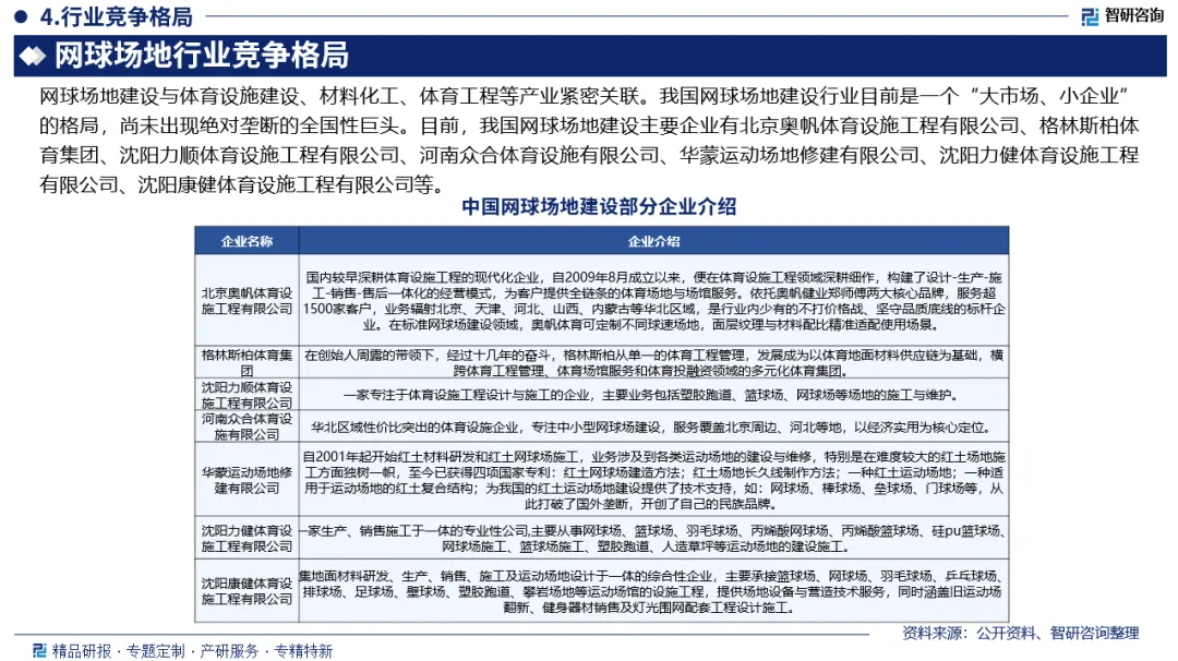 竞争情况:我国网球场地建设行业目前是一个“大市场、小企业”的格局,尚未出现绝对垄断的全国性巨头。目前,我国网球场地建设主要企业有北京奥帆体育设施工程有限公司、格林斯柏体育集团、沈阳力顺体育设施工程有限公司、河南众合体育设施有限公司、华蒙运动场地修建有限公司、沈阳力健体育设施工程有限公司、沈阳康健体育设施工程有限公司等。