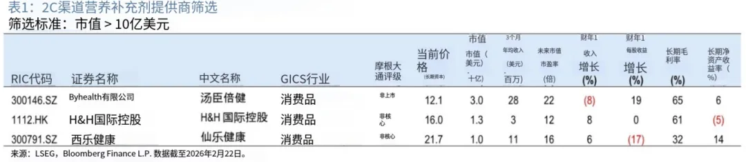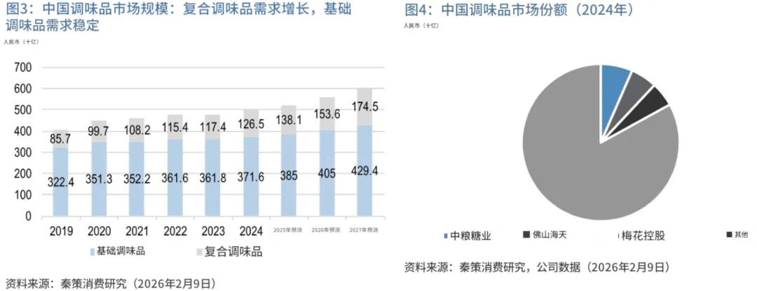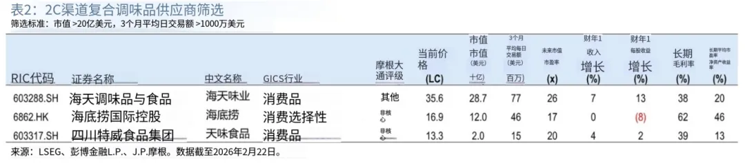 2026年的发展趋势是什么?(1) “朋克健康”:年轻一代比他们的父母更早开始服用保健品(例如辅酶Q10、叶黄素和Omega-3)。艾媒咨询预测,2026-2027年中国保健品市场将以每年中等个位数的速度增长,主要增长动力来自1990-2000年出生的人群,而该年龄段人群的市场份额高度分散。(2)预计2025/26年复合调味品市场将增长4%/5%,而基础调味品的需求保持稳定(图3),部分原因是“脆弱青年”对预制食品的需求激增。CR5行业的集中度仍然较低,约为40%。(3)优质蛋白质:尽管中国人均热量摄入保持稳定,但“脆弱青年”及其父母、祖父母对优质蛋白质(优质牛肉、地理标志认证羊肉、海鲜、黑猪)的需求不断增长。据ChinaBric报道,黑猪面临15-20%的供需缺口,因为高端渠道(盒马鲜生、山姆会员店)的订单增长速度超过了供应速度(同比增长约3%)。业内专家预测,黑猪占猪肉总产量的比例将从2025年底的3.1%上升到2026年底的4.5%(增长45%)。摩根大通将万洲国际集团(WHGroup)的评级定为OW。