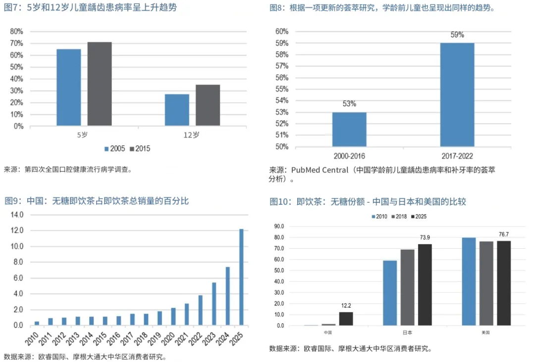 糖的摄入量可能不得不有所减少:中国第四次全国口腔健康调查(2018年)发现,五岁儿童的龋齿率高达71.9%,比十年前上升了5.8%。“2030健康中国”指令设定了到2030年将12岁以下儿童龋齿率降至25%以下的目标,这意味着未来人均糖摄入量需要减少。摩根大通的徐杰西指出,美国和日本的即饮茶中超过70%是无糖的,而中国大陆只有12%是无糖的。