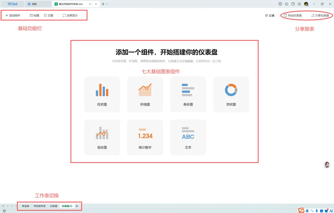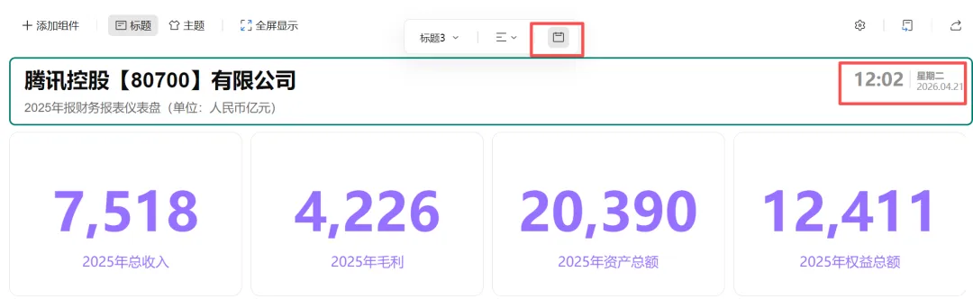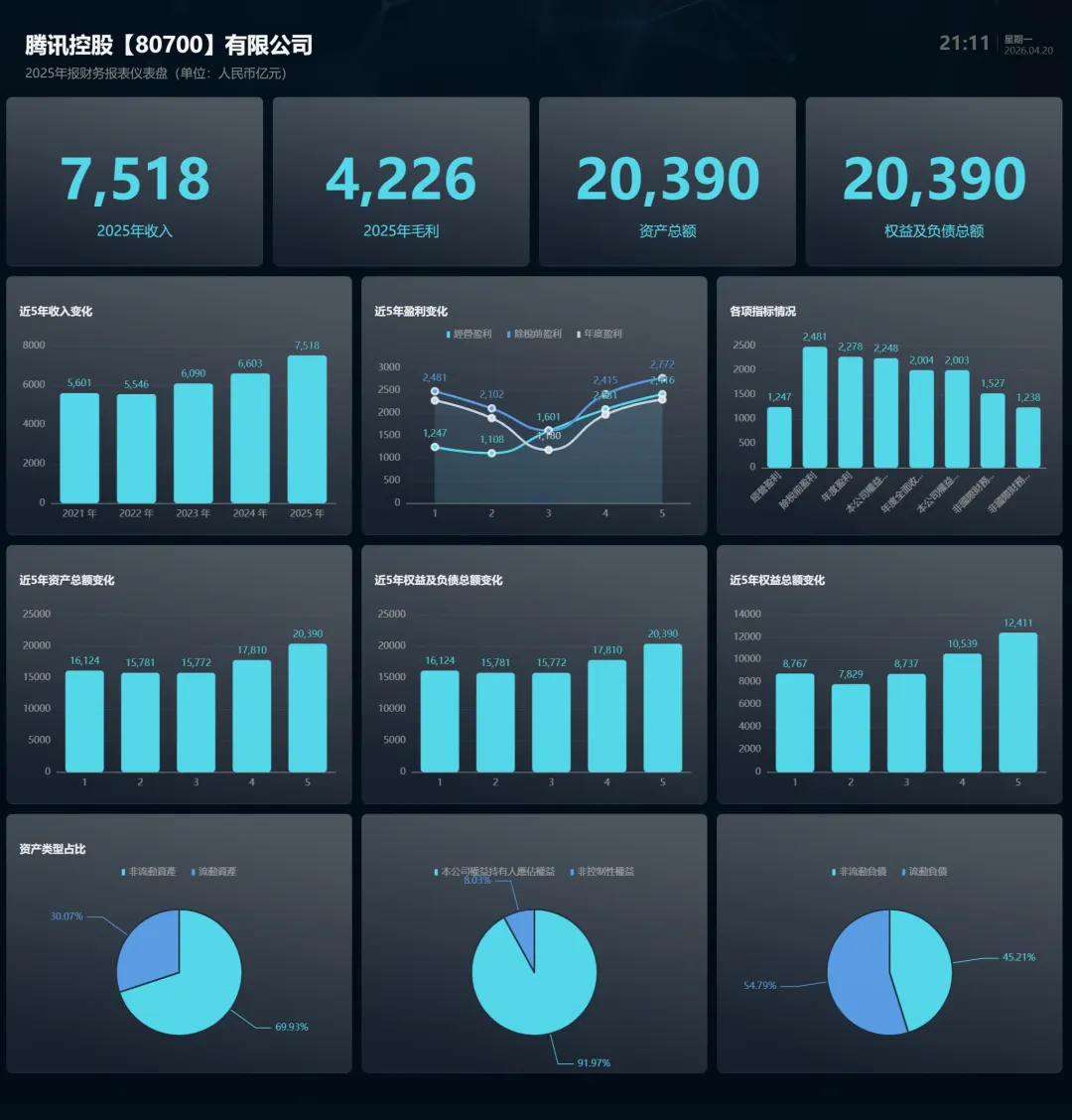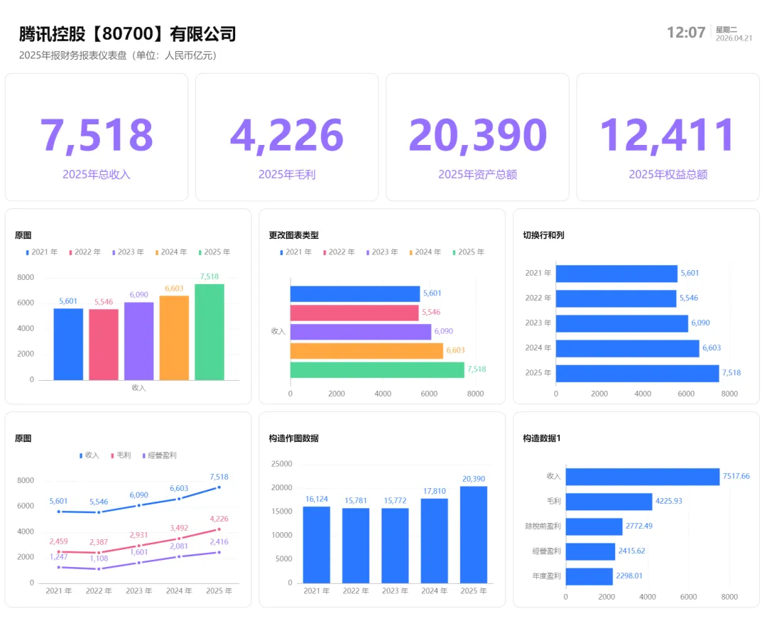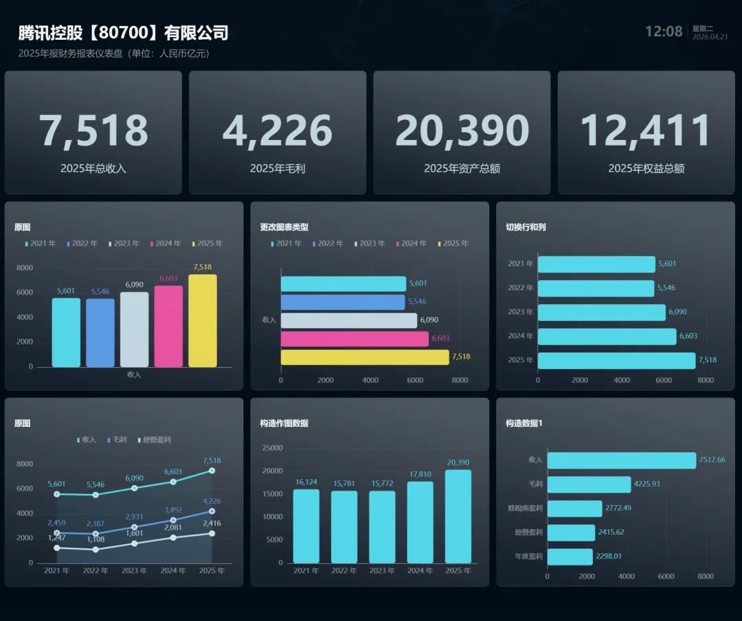 我觉得现在市面上大多数仪表板功能对初学者非常友好,例如腾讯文档、飞书文档也有类似的功能。在线报表明显优势就是方便分享,做起来效率就是高,拥有权限的人轻松修改。仪表板的图表都是模块化,能尽最大程度保证图表规范化、主题统一等,所以看起来更有高大上fee作为腾讯股东,这里为了方便大家了解WPS仪表板制作过程,以及注意事项。请允许我用腾讯控股的2025年财报作为案例,分享给大家。同时,作为牛马的我表示,日常接触就这两种表,或者是从一坨屎般的报表里面,整理出这样的报表。你可以打开WPS,把上面的2个报表复制到工作表里面,用做数据源。关键来了,选择插入选项卡,找到仪表板。那么,你就能进入一个全新的世界,叫仪表板世界。整体仪表板功能非常简洁、主要有基础功能栏、报表设计,和七大基础图表组件构成。我们以统计数字入手,开始第一个仪表板组件。这些我之前在Excel数据看板和大家说是关键数字,KPI之类。都是同一个意思哈。在修改范围,你可以选择单个单元格,或者连续的单元格区域。一整列也是连续的单元格。有些图表是全选全部数据源,则显示表头(也就是字段名)。统计说明和数字下方的文字说明对应,统计方式可以选择求和、计数、最大、最小、平均、去重等。在图表样式,能设置对应的颜色、统计格式,小数点位数和是否显示千分位分隔符。牛马的工作就是做完了一个,还有好几个。幸好这个数字统计能复制在新的图表框选择配置,修改对应的数据源、说明、统计方式,就能得到新的数值或图表。添加图标插入柱形图,在图表类型可以更改,数据源修改范围,切换行列,以及对应字段的统计方式等等。在图表类型就能修改成条形图、折线图、饼图或组合图等。在配置的切换行和列中,原来的图例就变成了坐标轴标签,也变成了同一色系。还有如果都是表示同样的,图例那就可以删除。在配置的图表样式中把图例的勾选去除掉。但这样在做报表时,发现了新问题,例如在表头与要呈现数据不相邻时,就无法同时选中。这不像在普通的表格中,能按着Ctrl多选。遇到这种情况只能构造作图数据,使用“=”直接引用数据,把数据引用过来。黄色部分为作图数据。如果出现作图数据会显得不美观,那我们可以把作图数据的字体改为白色,那就看似隐藏了。如果要构造作图数据的图表较多,可以新建一个工作表,用于构造作图数据。这就相当于考试给你的草稿纸,不用给其他人看,自己知道过程即可,而看板仪表板是答题卡。那你可以直接隐藏这个过程表,丝毫不会对报表产生影响,而且她还能跟随数据源的变换。点击标题就能实现编辑标题的名称,还可条件副标题描述。我这里就添加了单位:人民币千亿元。点击标题还能发现有个日期的图标,点击就能再右侧添加时间日期。有些领导或老板比较喜欢暗黑科技风元素,作为牛马只好跟着做。在主题中提供了7套主题颜色,能满足大部分的需求。如果老板还要求你换成别的颜色,那你只能在每个图表逐个调整了。偷偷和你说,如果你老板不懂,你直接和他说调不了,都是整套的,没法改