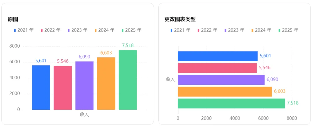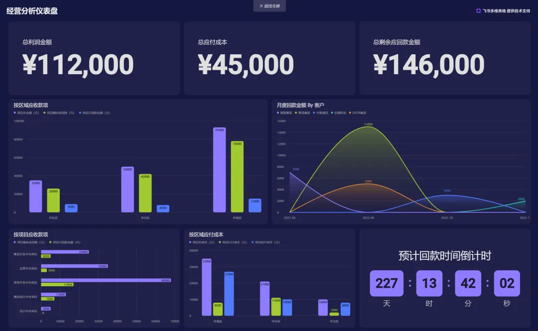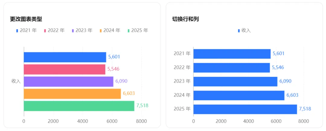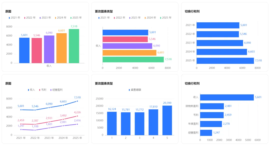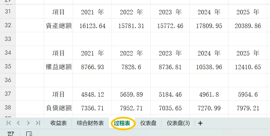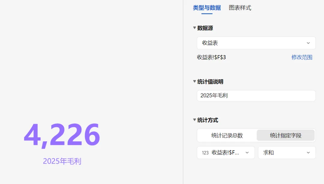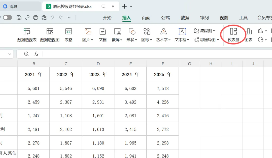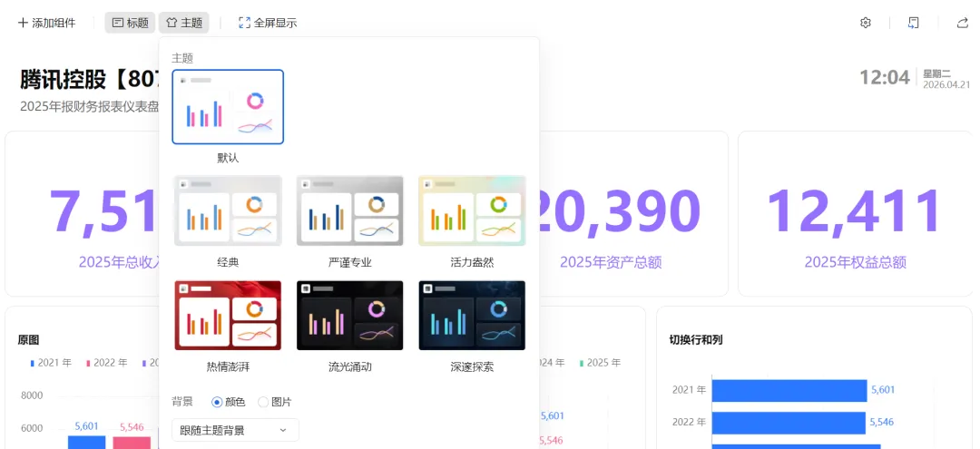 我觉得现在市面上大多数仪表板功能对初学者非常友好,例如腾讯文档、飞书文档也有类似的功能。在线报表明显优势就是方便分享,做起来效率就是高,拥有权限的人轻松修改。仪表板的图表都是模块化,能尽最大程度保证图表规范化、主题统一等,所以看起来更有高大上fee作为腾讯股东,这里为了方便大家了解WPS仪表板制作过程,以及注意事项。请允许我用腾讯控股的2025年财报作为案例,分享给大家。同时,作为牛马的我表示,日常接触就这两种表,或者是从一坨屎般的报表里面,整理出这样的报表。你可以打开WPS,把上面的2个报表复制到工作表里面,用做数据源。关键来了,选择插入选项卡,找到仪表板。那么,你就能进入一个全新的世界,叫仪表板世界。整体仪表板功能非常简洁、主要有基础功能栏、报表设计,和七大基础图表组件构成。我们以统计数字入手,开始第一个仪表板组件。这些我之前在Excel数据看板和大家说是关键数字,KPI之类。都是同一个意思哈。在修改范围,你可以选择单个单元格,或者连续的单元格区域。一整列也是连续的单元格。有些图表是全选全部数据源,则显示表头(也就是字段名)。统计说明和数字下方的文字说明对应,统计方式可以选择求和、计数、最大、最小、平均、去重等。在图表样式,能设置对应的颜色、统计格式,小数点位数和是否显示千分位分隔符。牛马的工作就是做完了一个,还有好几个。幸好这个数字统计能复制在新的图表框选择配置,修改对应的数据源、说明、统计方式,就能得到新的数值或图表。添加图标插入柱形图,在图表类型可以更改,数据源修改范围,切换行列,以及对应字段的统计方式等等。在图表类型就能修改成条形图、折线图、饼图或组合图等。在配置的切换行和列中,原来的图例就变成了坐标轴标签,也变成了同一色系。还有如果都是表示同样的,图例那就可以删除。在配置的图表样式中把图例的勾选去除掉。但这样在做报表时,发现了新问题,例如在表头与要呈现数据不相邻时,就无法同时选中。这不像在普通的表格中,能按着Ctrl多选。遇到这种情况只能构造作图数据,使用“=”直接引用数据,把数据引用过来。黄色部分为作图数据。如果出现作图数据会显得不美观,那我们可以把作图数据的字体改为白色,那就看似隐藏了。如果要构造作图数据的图表较多,可以新建一个工作表,用于构造作图数据。这就相当于考试给你的草稿纸,不用给其他人看,自己知道过程即可,而看板仪表板是答题卡。那你可以直接隐藏这个过程表,丝毫不会对报表产生影响,而且她还能跟随数据源的变换。点击标题就能实现编辑标题的名称,还可条件副标题描述。我这里就添加了单位:人民币千亿元。点击标题还能发现有个日期的图标,点击就能再右侧添加时间日期。有些领导或老板比较喜欢暗黑科技风元素,作为牛马只好跟着做。在主题中提供了7套主题颜色,能满足大部分的需求。如果老板还要求你换成别的颜色,那你只能在每个图表逐个调整了。偷偷和你说,如果你老板不懂,你直接和他说调不了,都是整套的,没法改