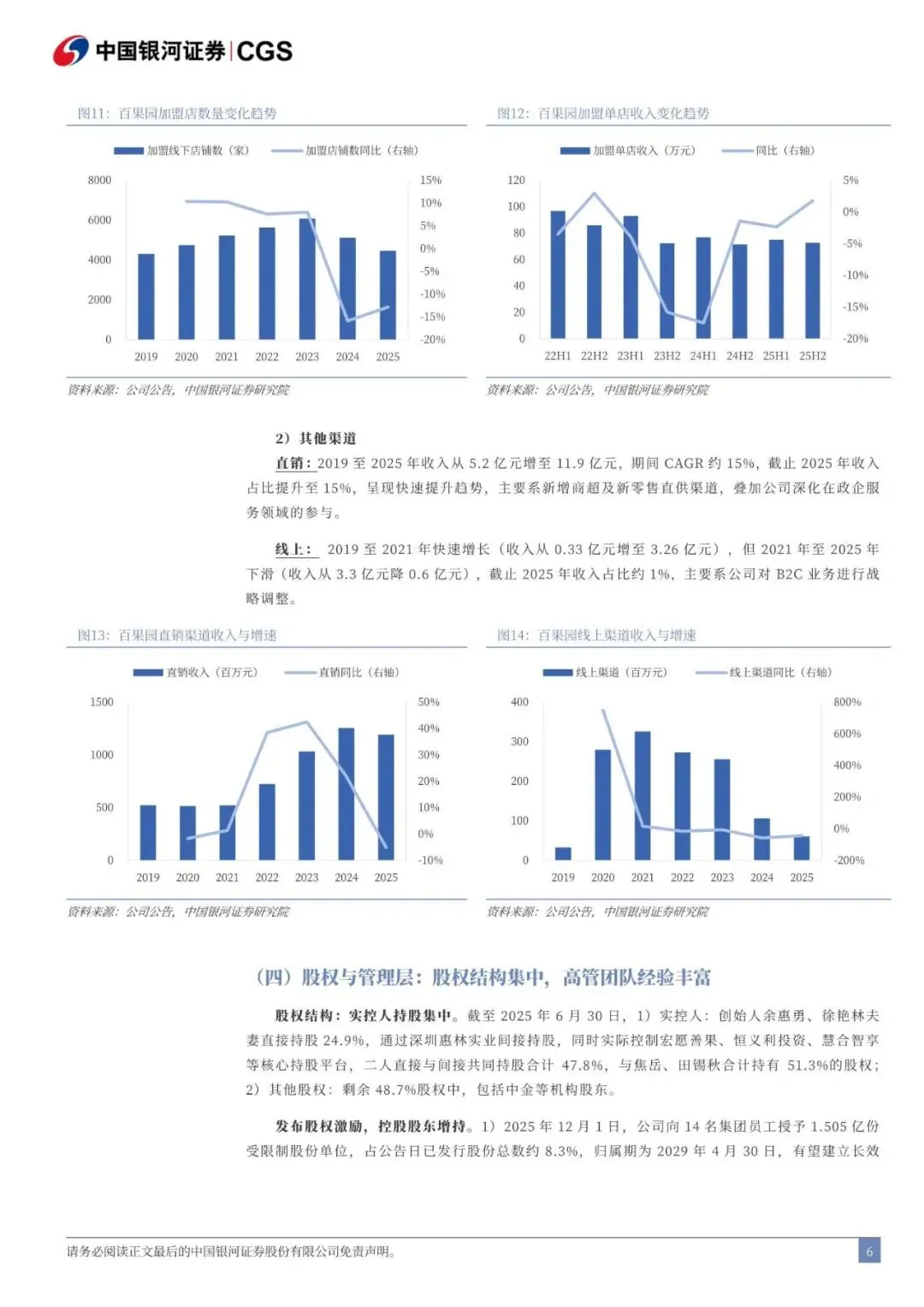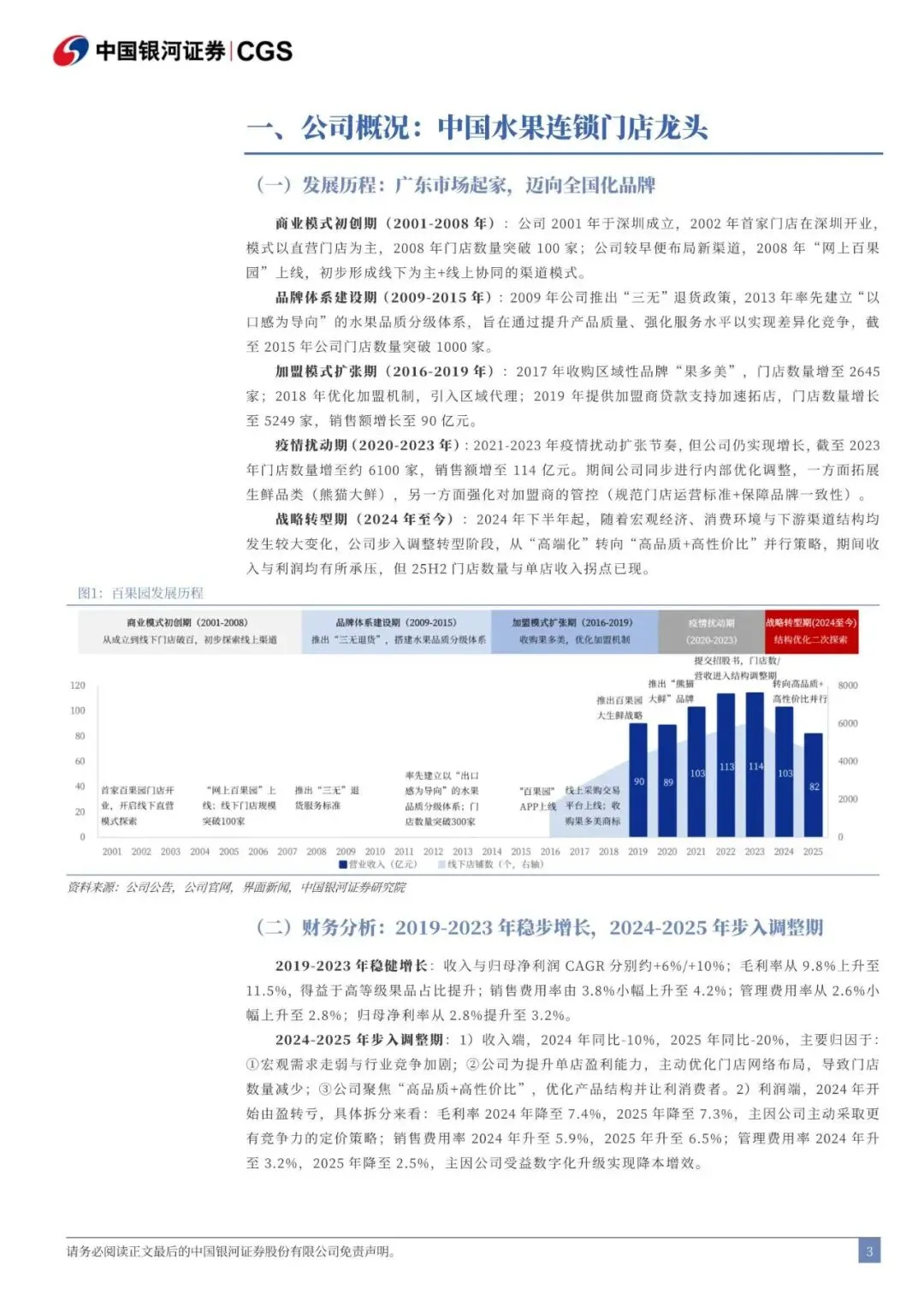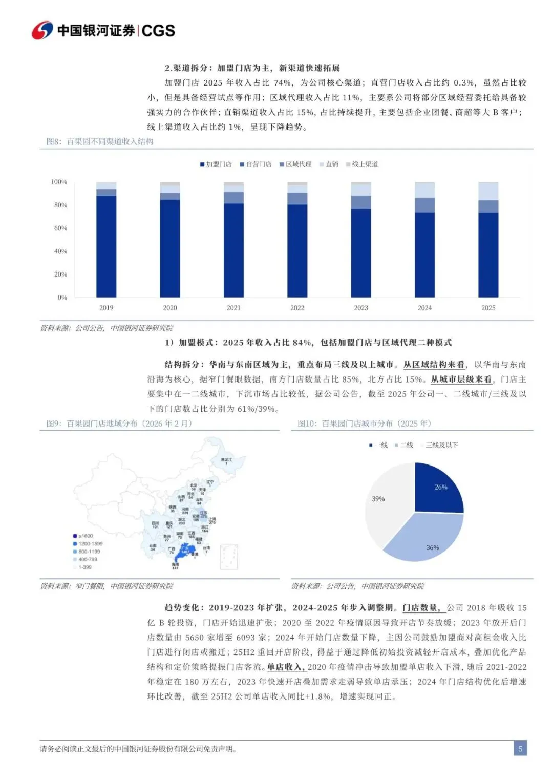公司介绍:转型“高质性价比”战略的水果连锁门店龙头。公司 2001 年成立于广东深圳,经历二十余年发展已成为全国化水果连锁门店品牌,收入峰值突破 110 亿元,门店峰值约 6000 家。品 类结构:主营高质性价比水果,高质产品与大众产品占比分别约 60%/40%,通过多元价格带布局满足不同消费者需求。渠道结构:加盟业务收入占比 84%(加盟门店 74%+区域代理 11%),为公司核心渠道,重点覆盖华南与东南区域,门店集中在三线及以上城市;直销渠道收入占比 15%,呈现快速上升趋势,包括企业团餐、商超等大 B 客户。