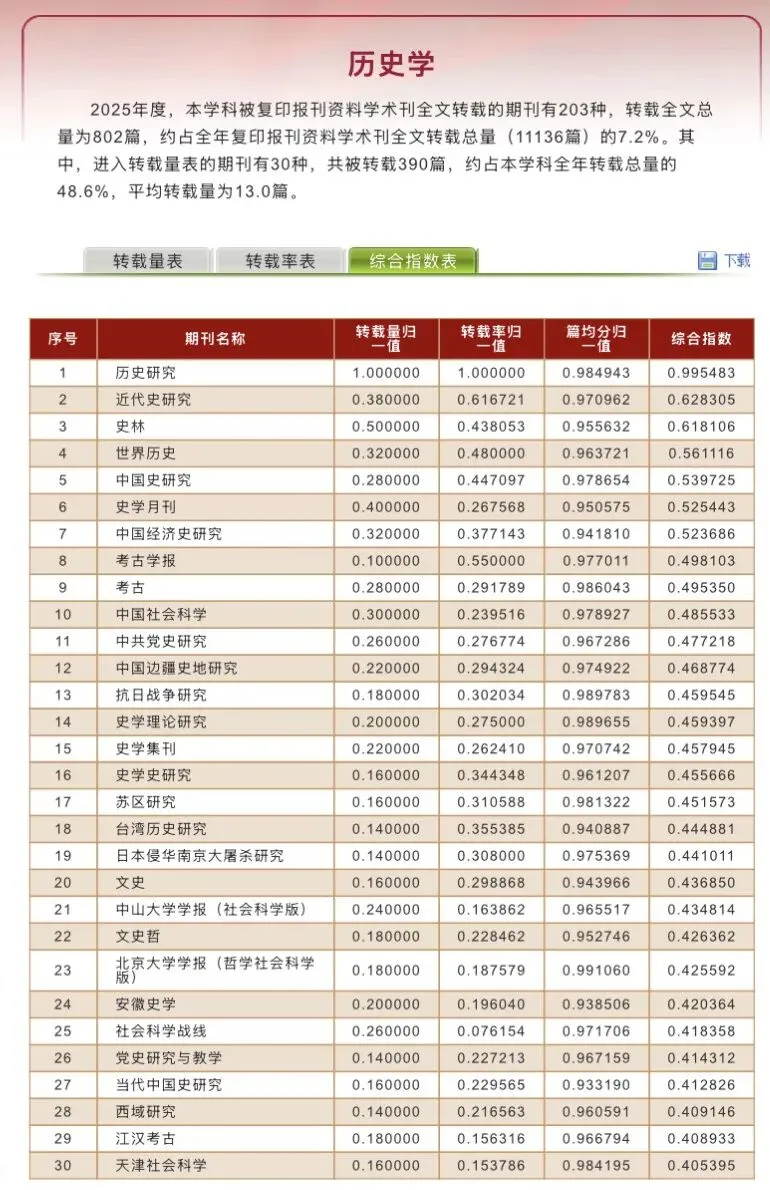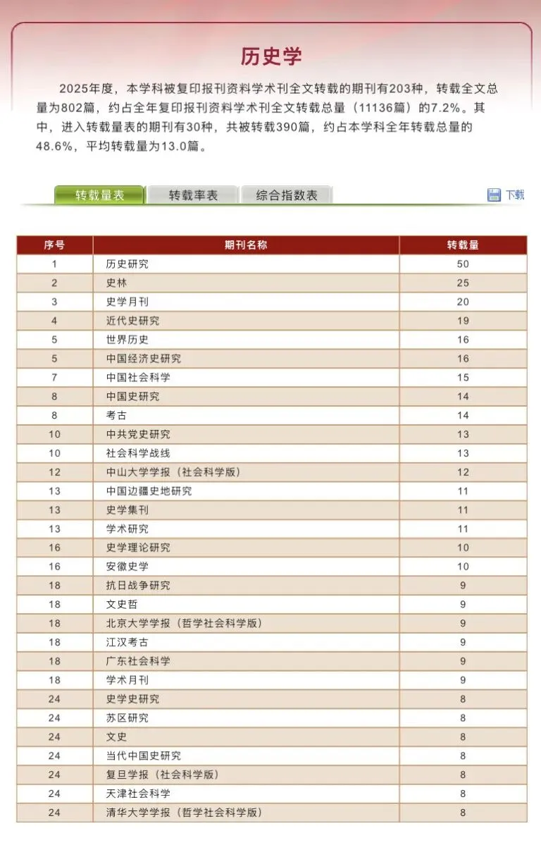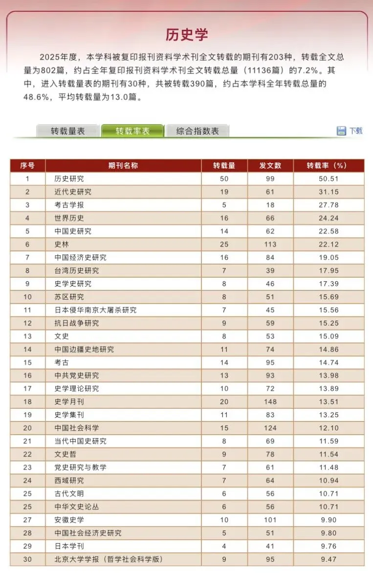 历史学复印报刊资料转载指数研究报告(2025年度)