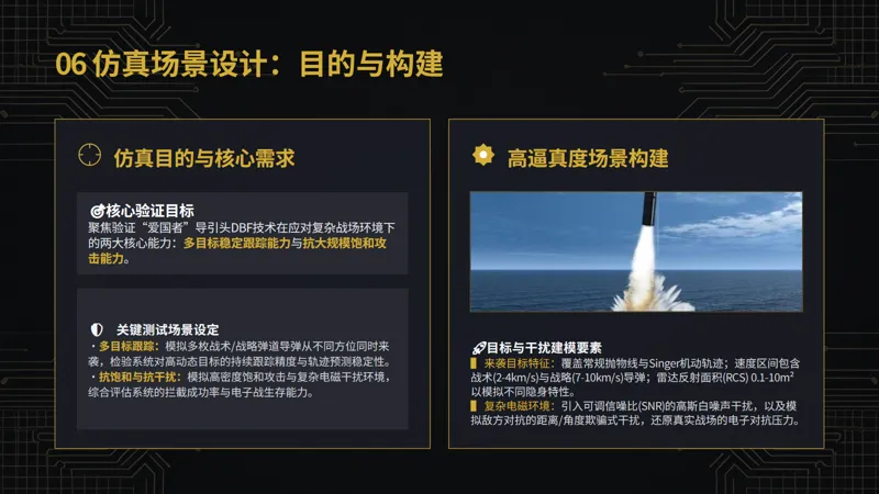 DBF 数字波束形成:传统 / MVDR/Capon 算法 多目标跟踪:JPDA+EKF(文档核心算法) 抗饱和攻击:50 目标模拟、波束快速切换(<0.1ms) 干扰抑制:LMS 自适应对消、噪声 / 距离 / 角度欺骗干扰 目标模型:Singer 机动模型、弹道导弹参数 性能评估:RMSE、关联正确率、拦截成功率