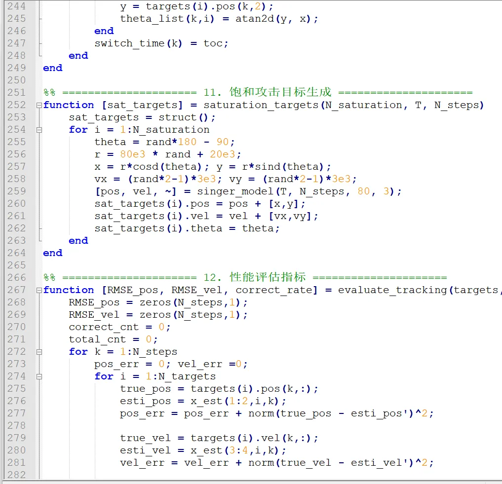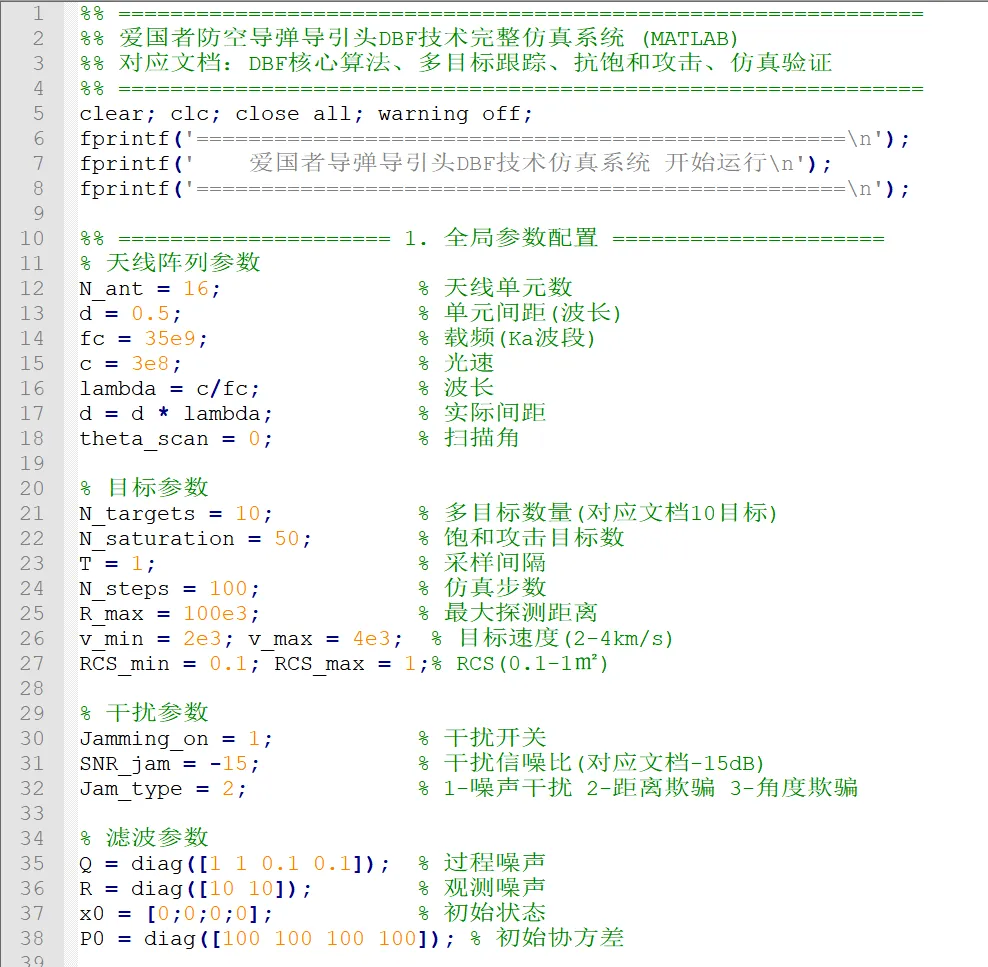 以下代码严格对应文档核心内容,实现:DBF 数字波束形成、多目标跟踪(JPDA+EKF)、抗饱和攻击、波束快速切换、干扰抑制、弹道目标模拟、电子干扰模拟、仿真结果可视化,可直接复制到 MATLAB 运行。