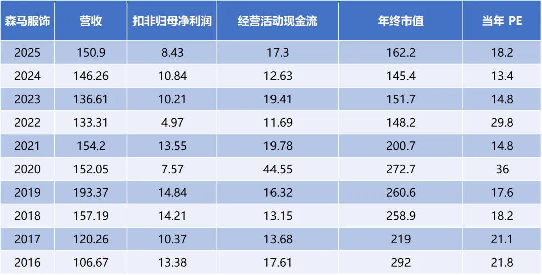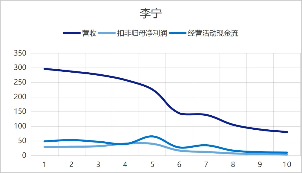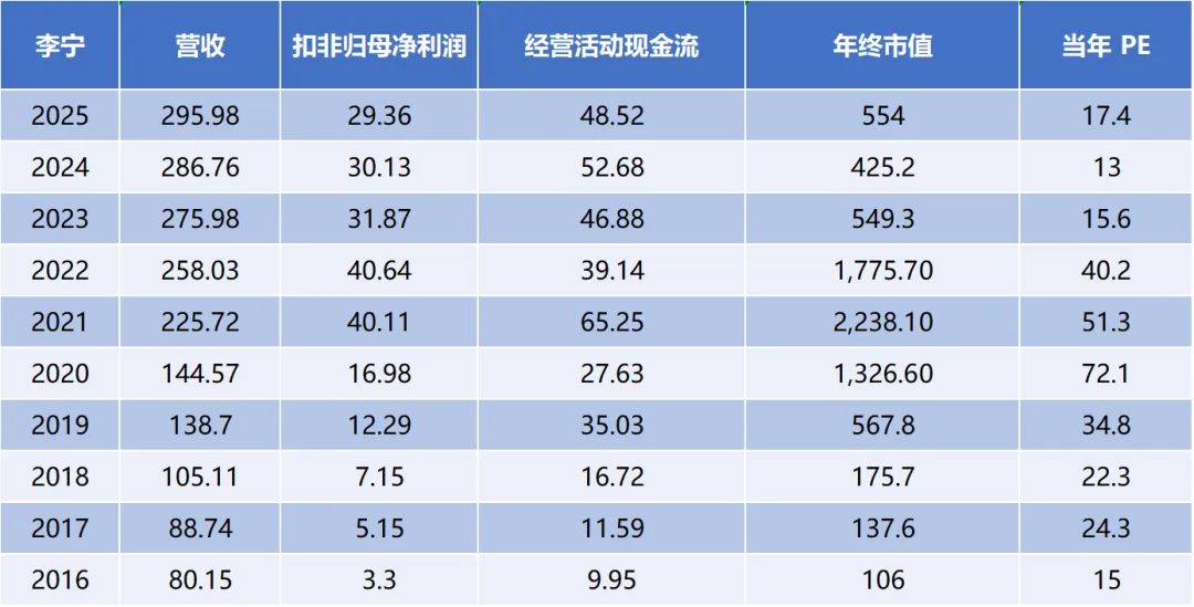 ②数据统计到2025年最后一个交易日,安踏的营收和现金流都一骑绝尘,扣非表现弱于李宁,但李宁的问题是扣非在2021年达到顶点后,到2025年下降了约25%