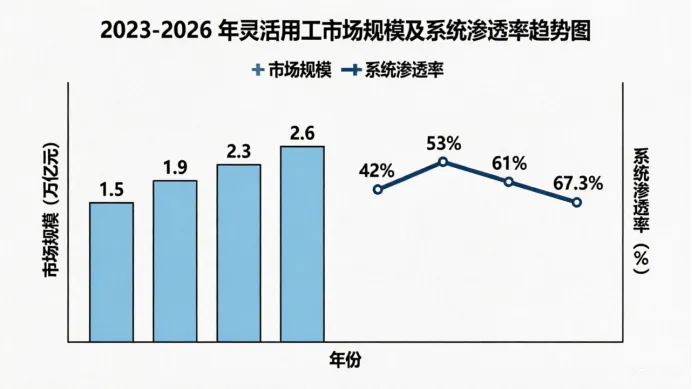 市场规模:2026年中国灵活用工市场规模突破2.6万亿元,同比增23.8%;灵活就业者超2.4亿人,占城镇就业近3成。 系统渗透率:数字化灵活用工系统覆盖率达67.3%,大型企业89%、中小微58%,互联网、物流、电商等行业全覆盖。 市场格局:CR5(前五平台)市占率45%,形成“综合头部+垂直服务商”格局,平台数量从2024年327家减至189家,行业出清加速。
