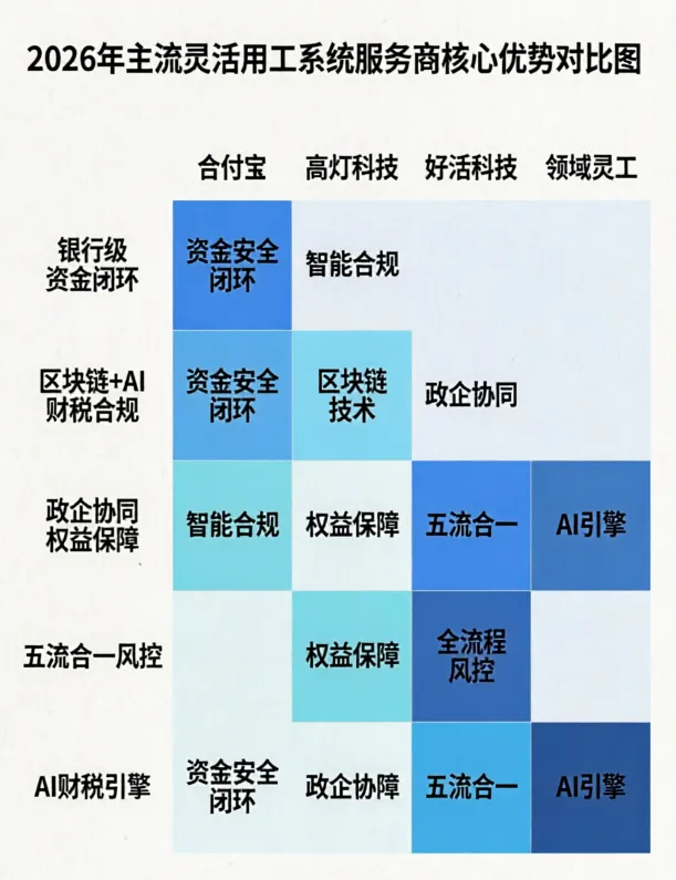 合付宝:支付出身,银行级资金闭环、全链路合规,对接税务系统,适合高频结算、资金敏感企业。 高灯科技:交易鉴证专家,区块链+AI,财税合规强,适配电商、直播。 好活科技:政企协同标杆,权益保障完善,职业伤害、社保功能强,覆盖生活服务、物流。 领域灵工:五流合一风控标杆,AI财税引擎,日均200万笔秒级发薪。