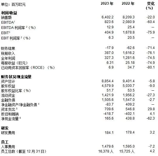 瓦克化学股份有限公司在3月12日发布的年度报告中确认,市场环境持续疲软导致2023财年的销售额和利润均明显低于上年。该化学集团上一财年实现销售总额64.0亿欧元,比2022年(82.1亿欧元)减少22%。产品价格走低,销售量减少是该值下降的主要原因。瓦克集团2023财年的息税折旧摊销前利润(EBITDA)为8.24亿欧元(2022年:20.8亿欧元),同比减少60%。除价格下降外,德国能源成本居高不下,全球原料成本走高也是此项业绩下滑的原因。产能利用率因销售量减少亦有所下降。瓦克集团目前正在实施的精益措施有效地节约了开支,对利润产生了积极影响。本期息税前利润(EBIT)因上述因素减少76%,降至4.05亿欧元(2022年:16.8亿欧元);折旧和摊销为4.19亿欧元,较上年(4.02亿欧元)略有增加。2023年全年利润3.27亿欧元(2022年:12.8亿欧元)。瓦克的股利政策是将当年约50%的净利润分派给股东。董事会和监事会将依此向年度股东大会提议每股发放股利3.00欧元。按2023年12月31日期末含息股票计算,派息总额为1.49亿欧元。“2023年,全球工业引擎运转不畅,化工行业面临的逆风尤其猛烈,我们也无法逃避。”瓦克总裁兼首席执行官贺达博士(Dr. Christian Hartel)周二在慕尼黑表示。“去年年初时预期的下半年需求回暖并未出现;通货膨胀率仍处于较高水平;价格压力增大;德国的能源价格与国际水平相比居高不下;全球原料成本走高,更是加重了化工行业的负担。这些都让我们无法保持2022年创纪录的业绩。”贺达博士在阐述对本年度的预期时指出:“经济疲软仍影响着我们客户在众多应用领域的订购行为。尽管今年年初,一些客户行业对有机硅的需求有所提升,但建筑业客户的态度仍尤为谨慎。这些都还无法让我们推断市场需求将出现持续扭转的局面。”瓦克今年头两个月的销售额因此明显低于上年同期。集团第一季度销售额预计可约达15亿欧元,EBITDA预期与上一季度持平。瓦克预计今年全年的业务将略低于上年,销售额预计在60亿至65亿欧元之间,EBITDA在6亿至8亿欧元之间,但预计今年的销售量将会增加。贺达博士表示:“今年经济如果复苏,销售量还有可能进一步提高。”但销售价格下降将是抑制利润增长的主因。瓦克通过加强成本控制来应对疲软的市场环境。贺达博士介绍说:“我们正在推行严格的人力资源政策,并在精简流程,节约非人力成本。”他强调:“就中长期而言,我们对未来的发展是乐观的。瓦克无论在战略上,还是财务上都健康稳健,并将一如既往地贯彻2030增长目标。”瓦克的目标是,至2030年销售额突破100亿欧元,EBITDA利润率超20%。贺达博士指出:“我们有三个有助实现目标的杠杆可用。首先,我们以产品组合来顺应全球大趋势:无论是可再生能源、电动汽车,还是数字化转型,这些趋势都将在中长期推动我们的业务发展。其次,我们正在全球范围扩建生产网络,坚持投资未来发展。第三,我们以可持续发展为商业模式,不断扩大可持续产品组合的比重。”贺达博士表示,瓦克员工的专业知识与技能,以及他们敬业的精神是此处关键。他说:“是我们的员工,在不断开发我们的产品,在推动我们全球范围内的生产网络扩建,以及对可持续发展的兑现——他们是瓦克未来成功的基础。”瓦克2023财年在德国境外和境内实现的销售额分别占销售总额的85%和15%,在各地区市场均有下降。瓦克去年在亚洲实现销售额27.5亿欧元(2022年:36.9亿欧元),同比减少26%;在美洲实现销售额10.4亿欧元(2022年:12.9亿欧元),同比减少19%;在欧洲实现销售额23.0亿欧元(2022年:28.3亿欧元),同比下降19%。瓦克2023年的资本支出为7.10亿欧元,比上年(5.47亿欧元)增加30%;资金主要用于扩建旗下四个业务部门的产能。瓦克正在博格豪森生产基地扩建半导体级多晶硅产能,并斥资扩建高纯氯化氢产能;高纯氯化氢是半导体生产的重要助剂。此外,瓦克还投入资金,在农特里茨生产基地和中国济宁分别扩建有机硅特种产品和有机功能性硅烷的产能。瓦克亦对中国张家港的特种有机硅产能进行了投资,还将中国南京生产基地的乳液及可再分散乳胶粉产能提高了一倍;该扩建工程历时数年,于2023年顺利竣工。在生物技术领域,瓦克正在德国哈雷建设信使核糖核酸(mRNA)技术中心,并将凭借这一实力,为德国未来抗疫应急准备工作贡献力量。该技术中心将于今年年中投入使用。瓦克还在2023年收购西班牙食品、制药及消费品合同生产商——ADL生物制药公司,加强了旗下生物技术业务。西班牙莱昂新生产基地和哈雷mRNA技术中心的建设,是瓦克生物科技业务部门在2023年树立的两个重要战略里程碑。瓦克集团2023财年新增员工653人。截至2023年12月31日期末,瓦克在全球共拥有员工16378人(2022年12月31日:15725人),其中,在德员工10621人(2022年:10424人),境外员工5757人(2022年:5301人)。瓦克2023财年净现金流量总计1.66亿欧元(2022年:4.39亿欧元)。利润减少,资本支出增加,以及收购ADL生物制药公司是此次业绩下降62%的主要原因。截至2023年12月31日期末,瓦克净金融负债0.84亿欧元(2022年12月31日:净金融资产4.09亿欧元)。集团资产截至2023年12月31日总计88.5亿欧元(2022年12月31日:94.0亿欧元),同比下降近6%。尽管集团资产主要因库存、债权和流动资金而减少,但这几项资产的价值仍保持在高额水平。截至2023年12月31日期末,瓦克的流动资产总计14亿欧元。股东权益因股利发放和集团净利润下降