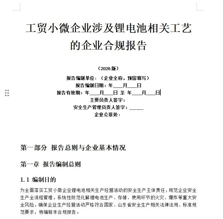 我们基于最新法规 + 山东地方标准 + 锂电行业高风险特点,打磨出一套小微企业直接套用的完整版合规报告,对标官方《工贸行业小微企业安全管理指南(锂电池篇)》,一次成型、一次达标。