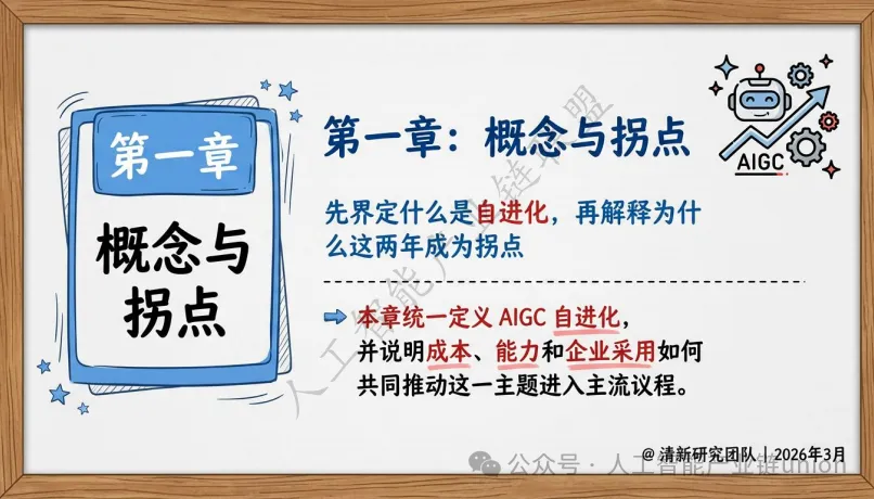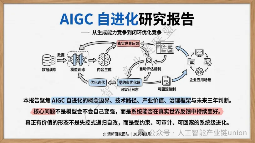 报告开篇即明确了“AIGC自进化”的核心定义:它不是科幻电影中那种失控的自我觉醒,而是一套反馈驱动的持续优化机制。 真正有价值的形态,是受约束、可审计、可回滚的系统级进化,而非不受控的模型自修改。