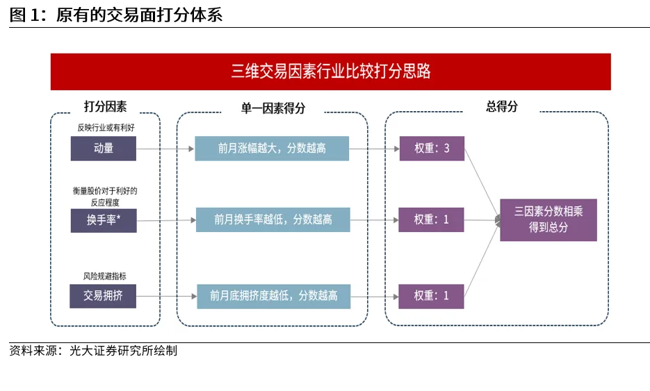 在此前报告中,我们用三个指标构建了交易面打分体系。在2025年3月7日外发的报告《交易面视角下的行业比较思路——行业比较研究系列之五》中,我们结合动量、换手率、交易拥挤度三个指标构建了交易面的打分体系。整个打分体系逻辑为对存在利好但股价尚未完全反映,同时交易不拥挤,即“强动量+低换手+低拥挤”的行业打高分,而对不符合该逻辑的行业则打低分。