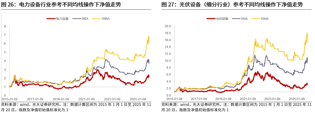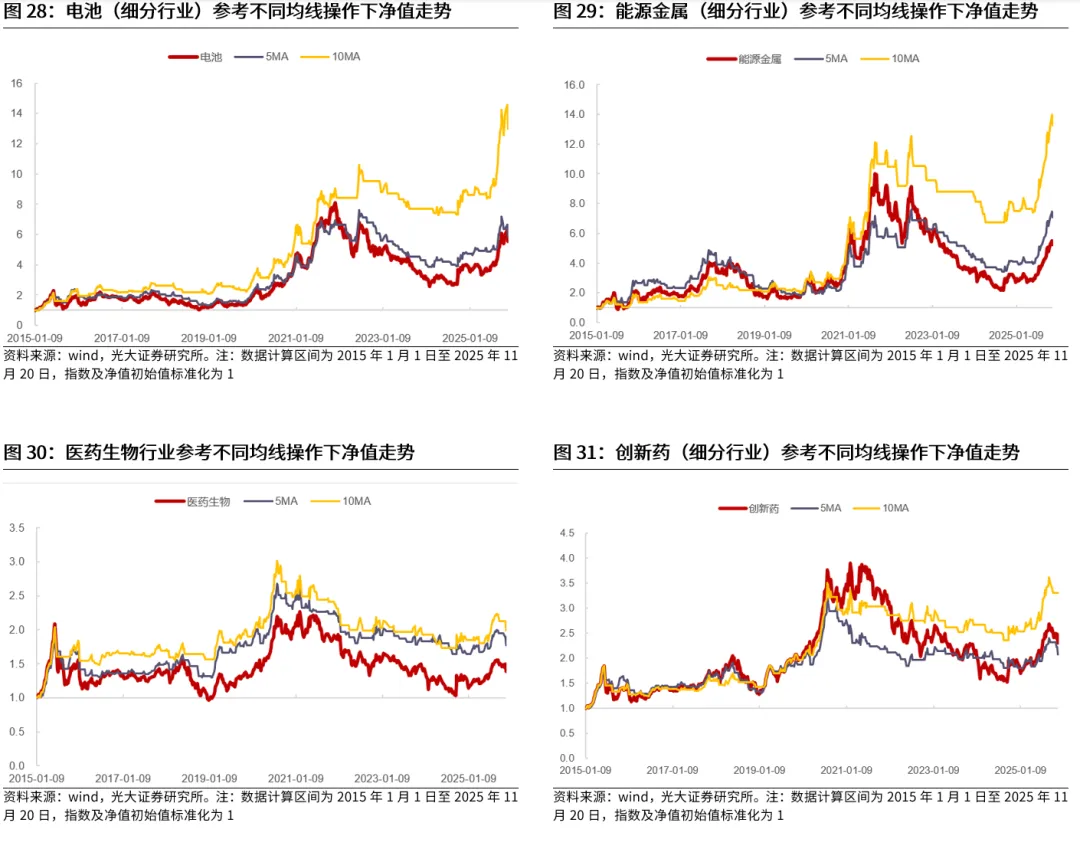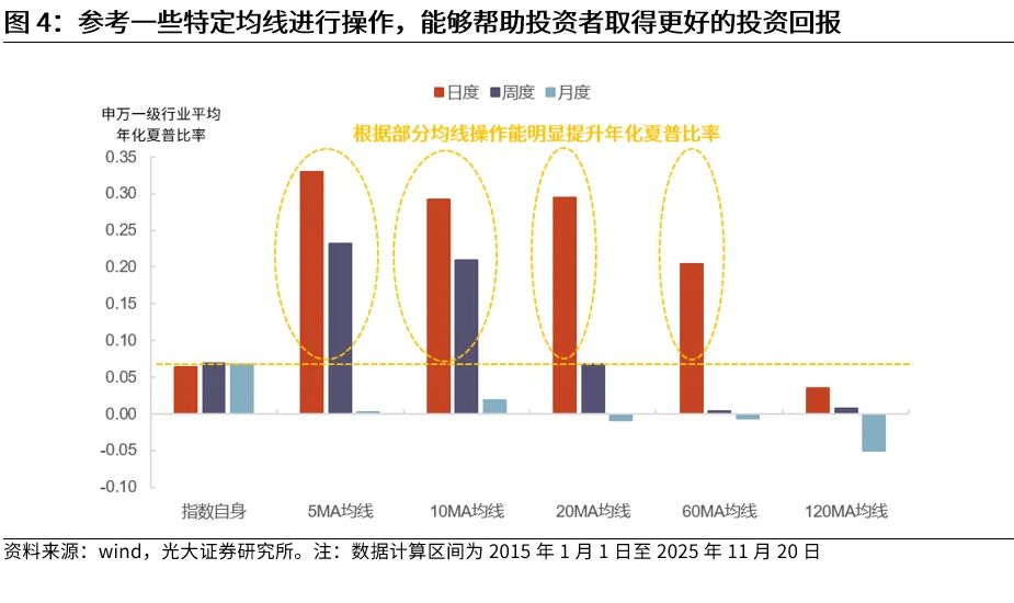 整体来看,一些特定均线的确能够帮助投资者取得更好的投资表现。我们选取了申万一级行业,对常见的均线参数,在2015年1月至2025年11月区间内进行了回测。从各行业的平均年化夏普比率情况来看,有一些特定参数设置的均线相比于指数自身而言,能够取得更高的夏普比率,这意味着均线对于提升投资表现具有一定帮助。