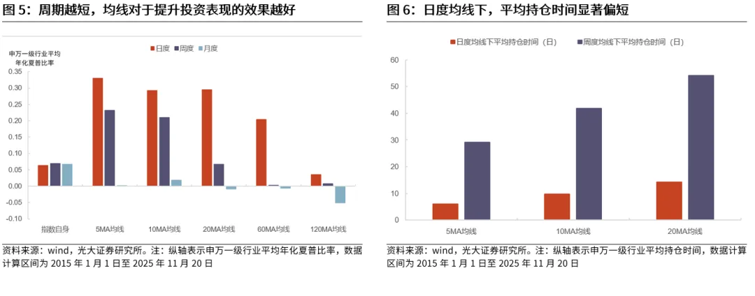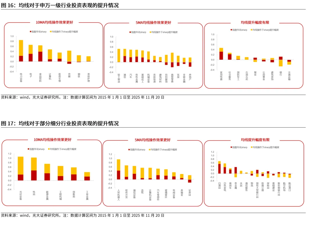 从申万一级行业的整体回测效果来看,可以发现周期越短,均线对于提升投资表现的效果越好。在2015年1月至2025年11月的回测区间内,整体而言,可以发现均线参数的周期越短,相比于指数自身的夏普比率而言,投资表现会越好,即夏普比率的提升幅度会越高。相同计算周期下,日度均线>周度均线>>月度均线。