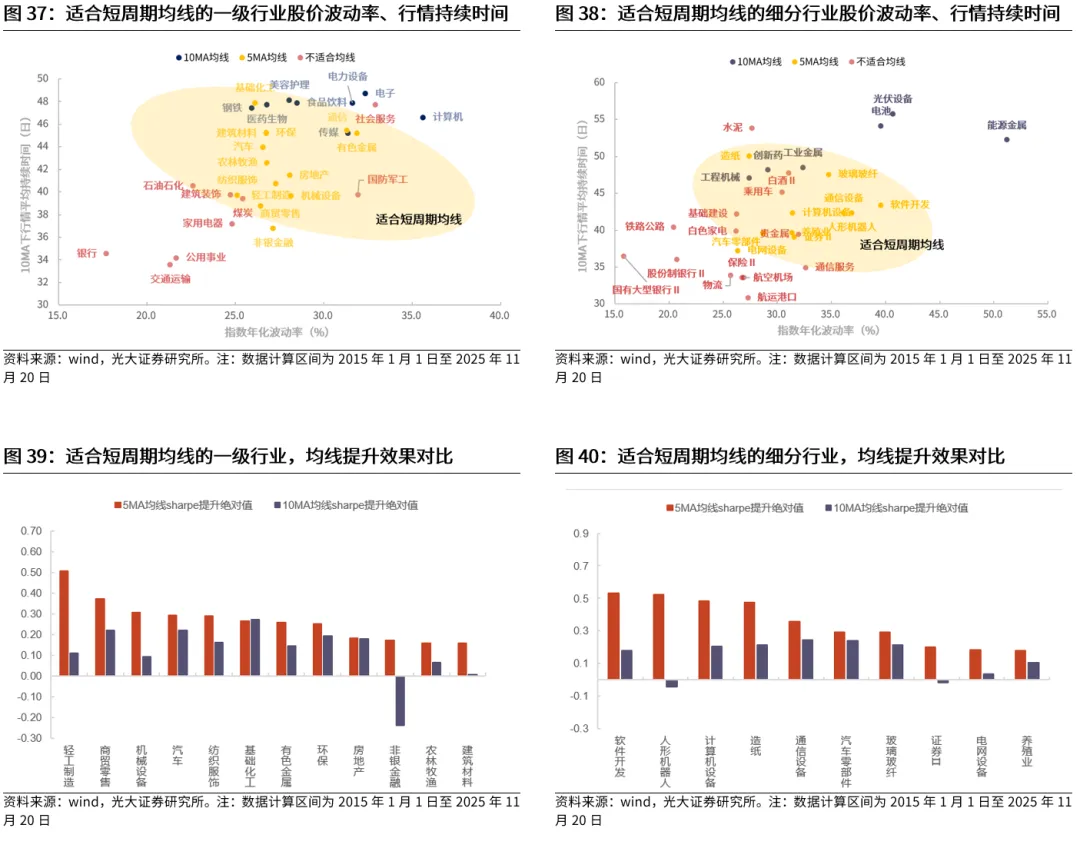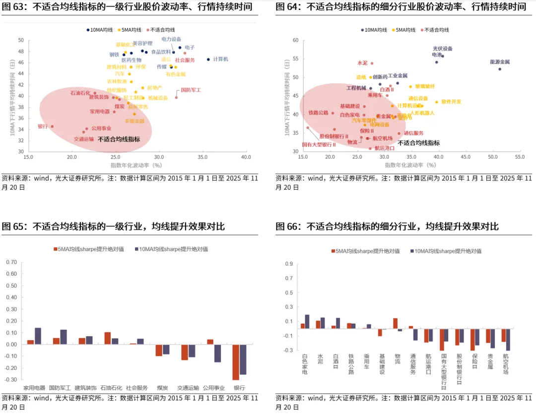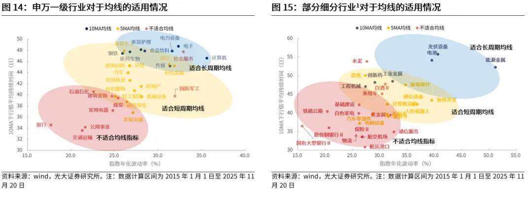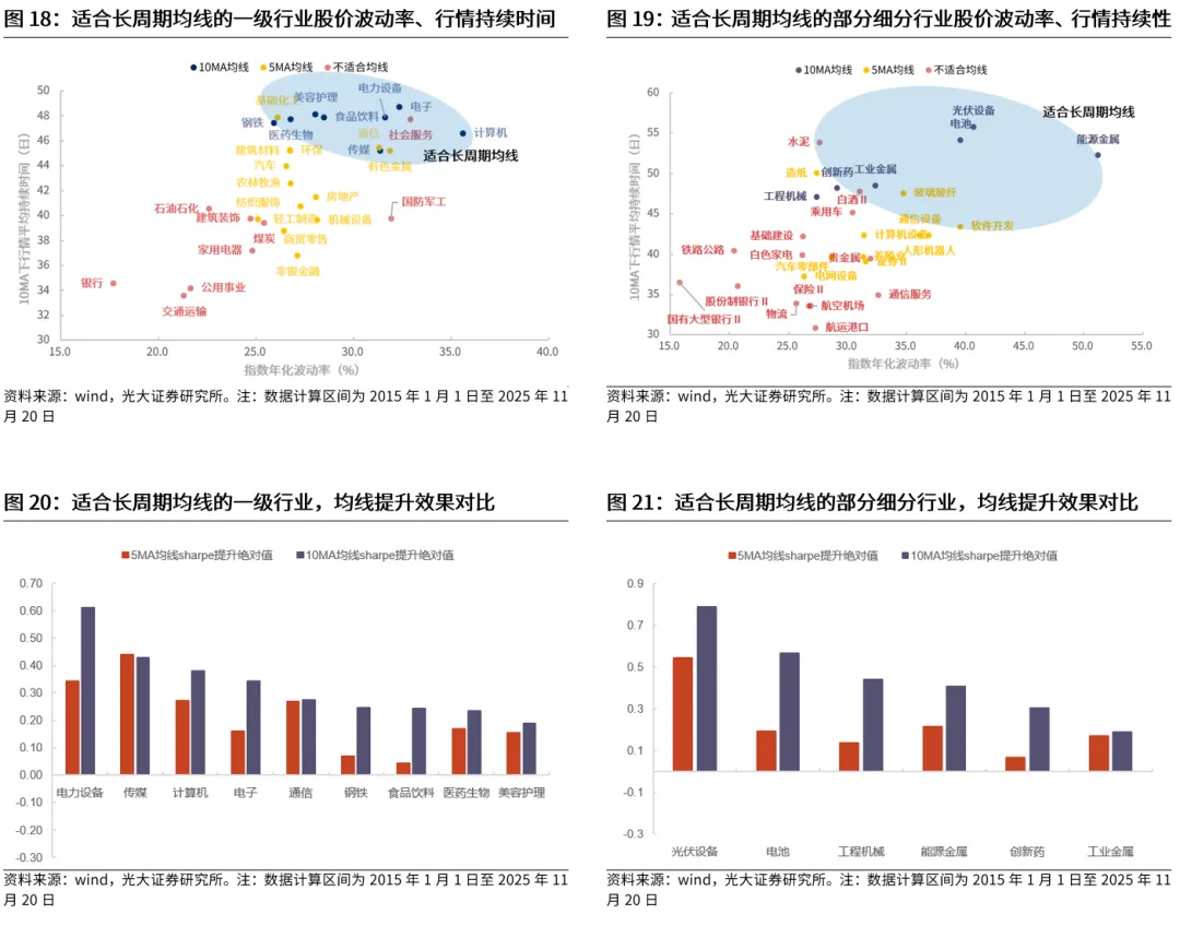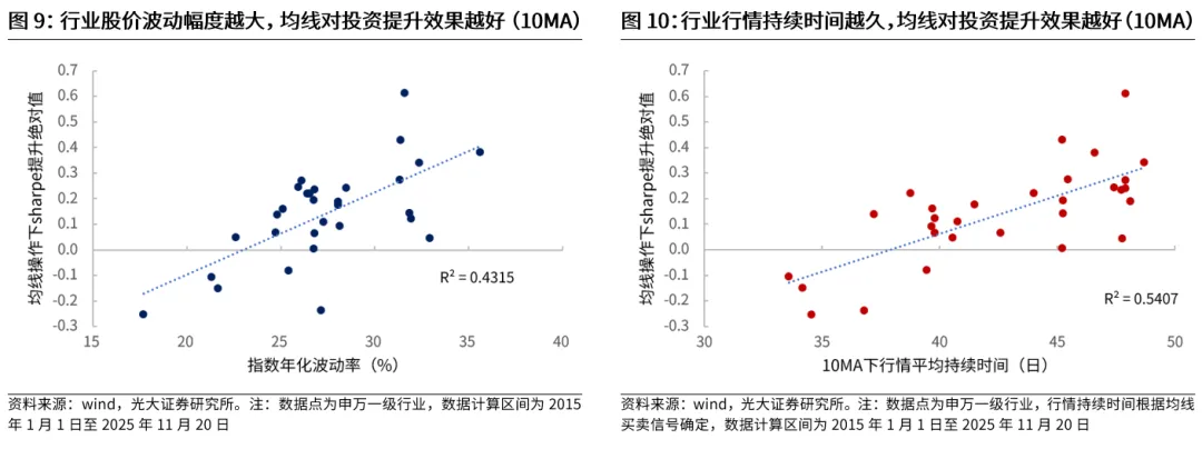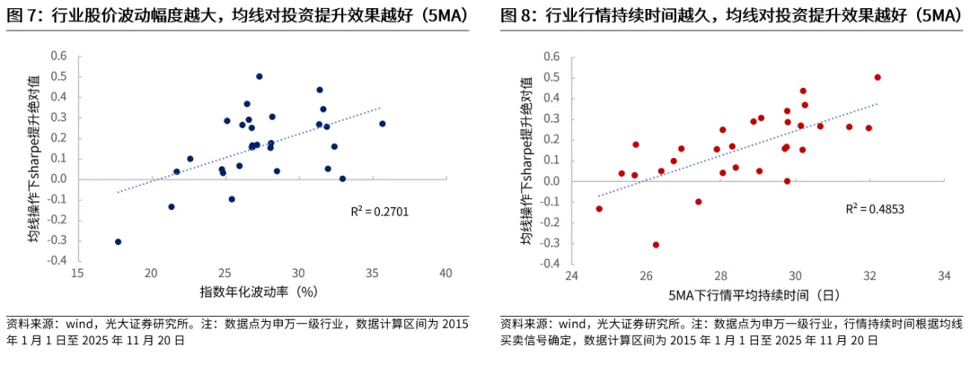 行业端实际数据也验证了这一观点,均线的有效性主要与股价波动幅度、行情持续时间两个因素有关。通过检验2015年1月至2025年11月期间的申万一级行业数据,可以发现,行业指数的年化波动率越高,根据均线进行操作的投资夏普比率也会越高,而行业行情的平均持续时间越久,根据均线进行操作的投资夏普比率同样也会越高。