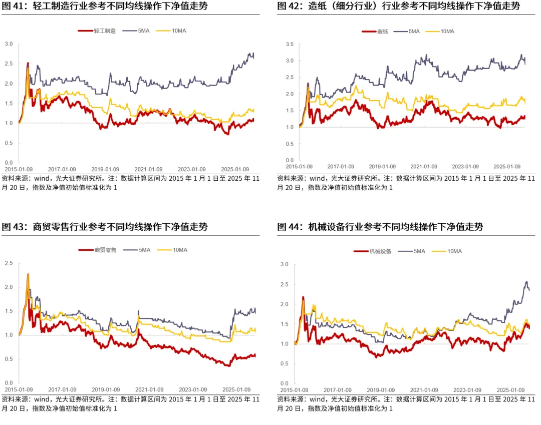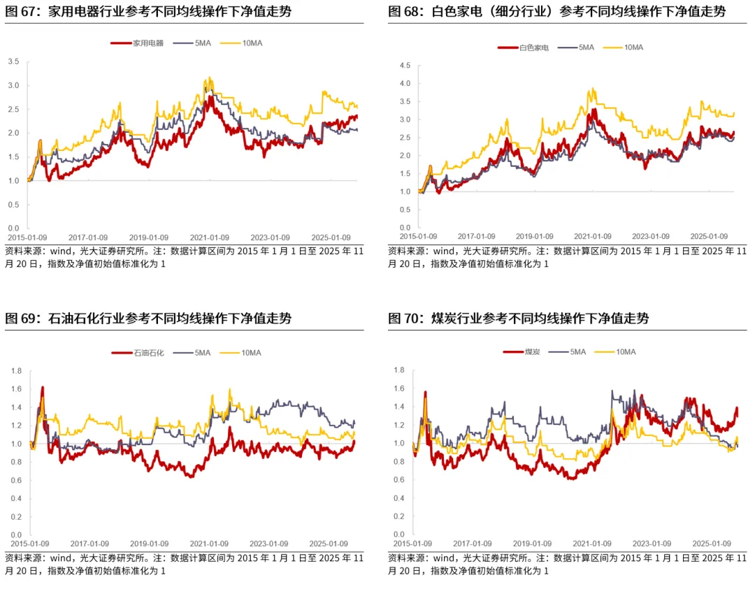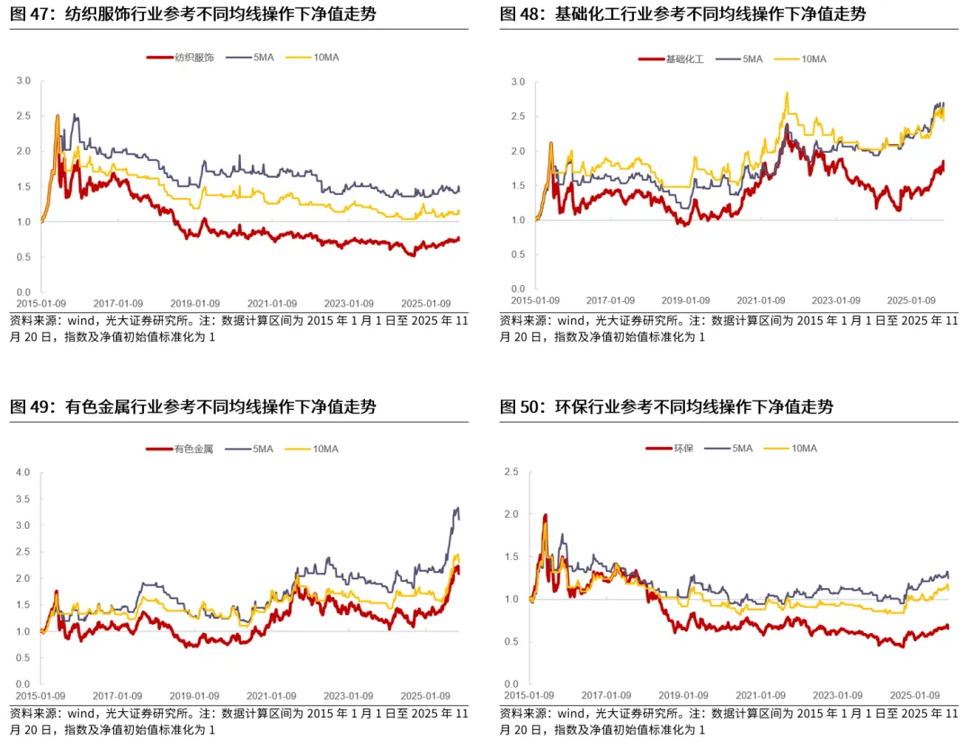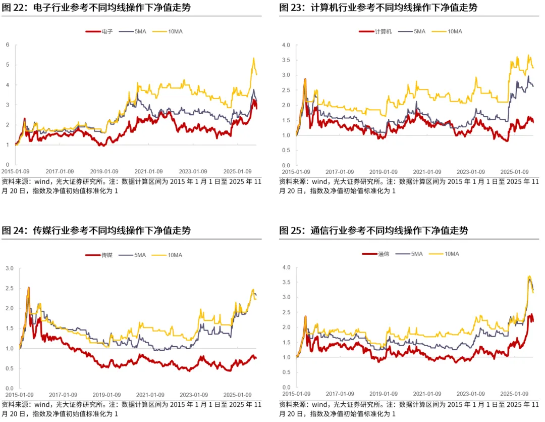 典型的行业包括TMT、电力设备、医药等。电子、计算机、传媒、通信、电力设备、医药生物等行业作为典型的成长行业,历史来看,在长周期均线信号的指引下,相比于指数自身而言,普遍能够取得更好的表现,而短周期均线对于这些行业的指引可能较为一般。