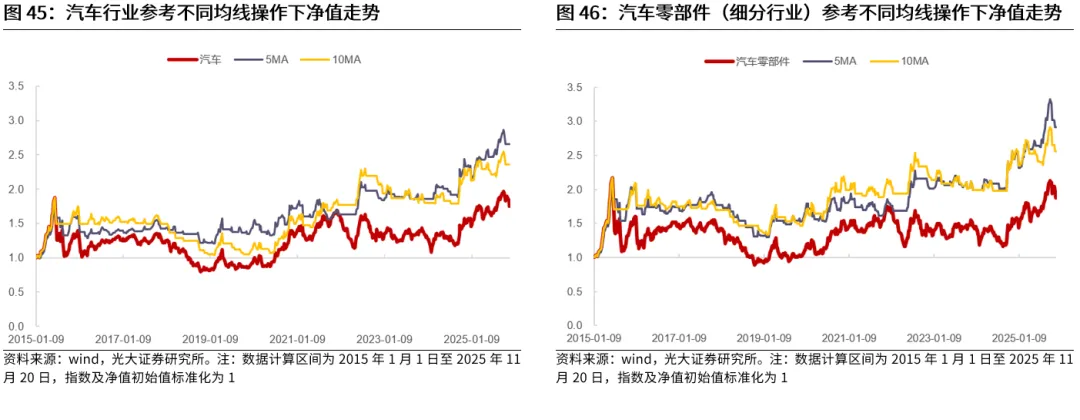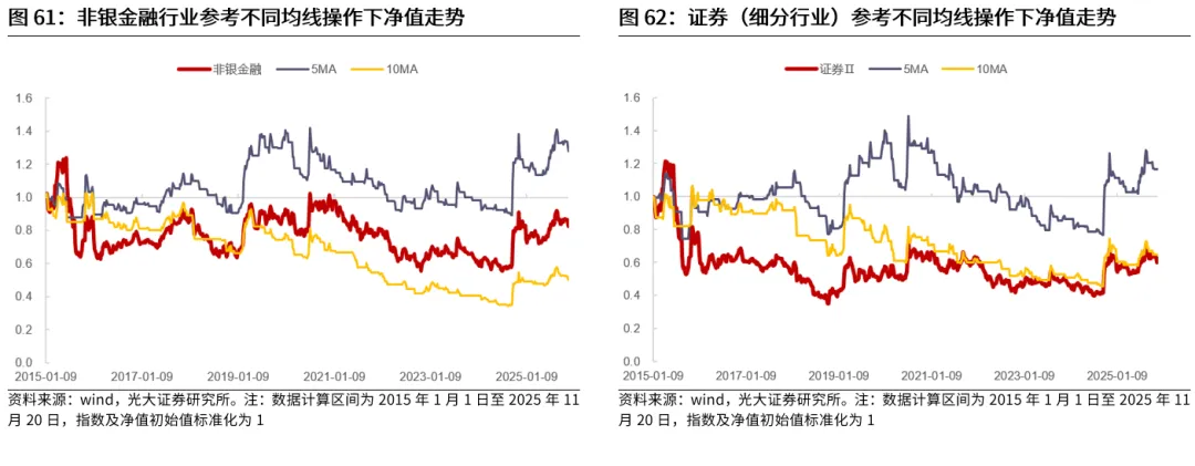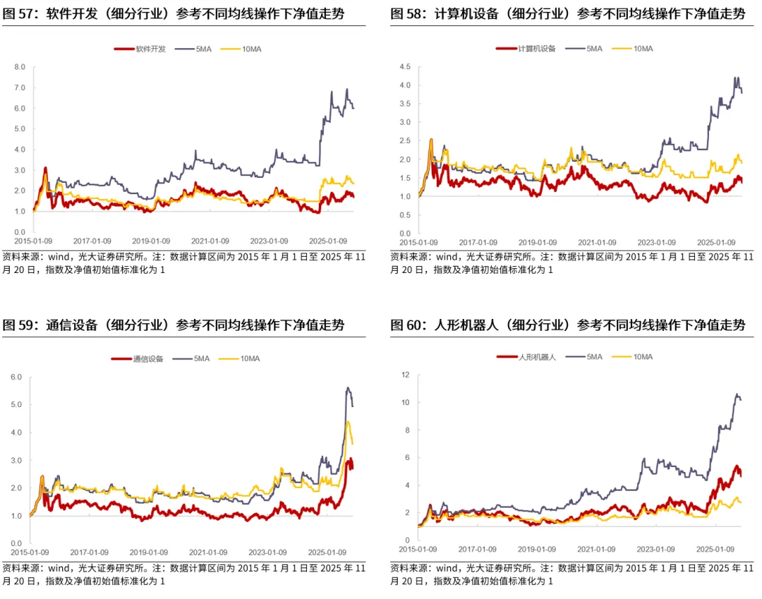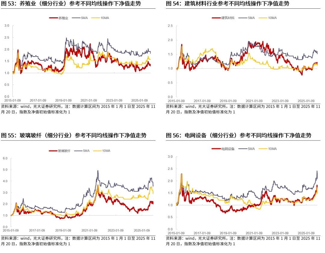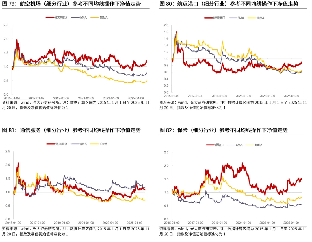 典型的行业包括TMT、电力设备、医药等。电子、计算机、传媒、通信、电力设备、医药生物等行业作为典型的成长行业,历史来看,在长周期均线信号的指引下,相比于指数自身而言,普遍能够取得更好的表现,而短周期均线对于这些行业的指引可能较为一般。