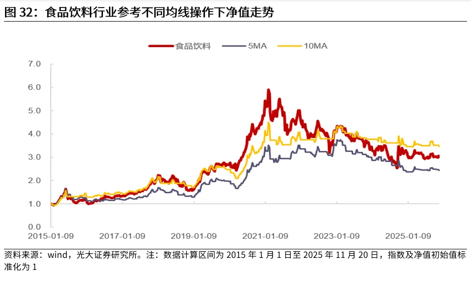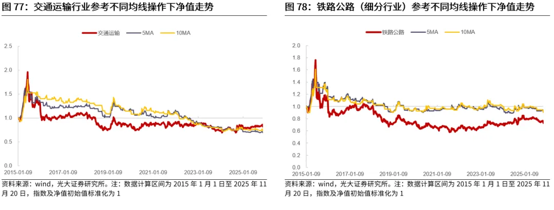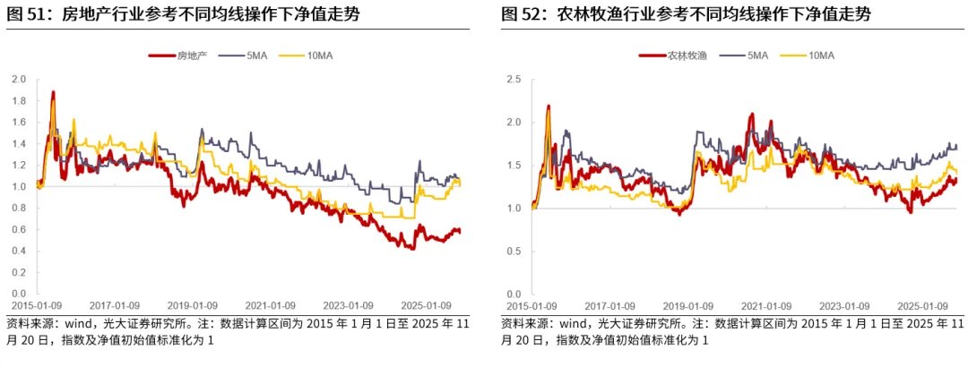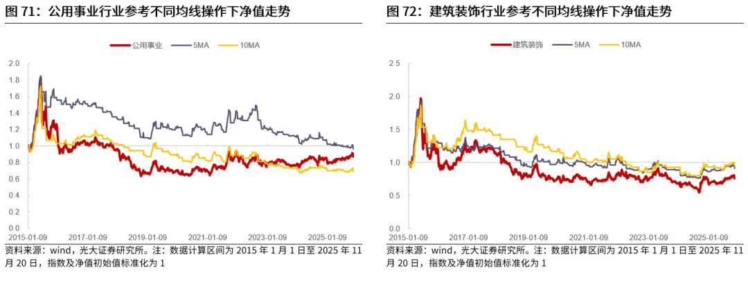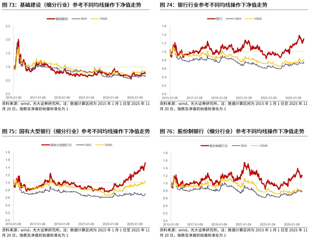 对于行业股价波动幅度通常较小、行情持续时间短的行业,均线往往会出现失效,无法提升投资表现。对于股价波动幅度较小的行业,无论是短期均线还是长期均线,往往在行情尾声才会发出信号,因此均线信号在大多数时候均会出现失效,并不能对投资有所指引。从实际情况来看,不适合使用均线指标的行业大多也具有低波动率、行情持续时间短的特征。