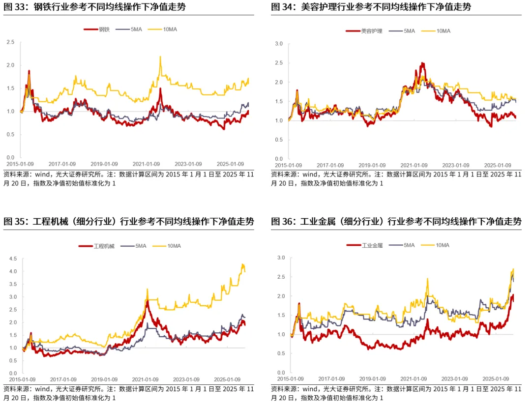 此外,食品饮料、钢铁、美容护理虽然为顺周期行业,但股价波动幅度均较大,行情持续性也较好,也更为适合用长周期均线。食品饮料过去曾经是最热门行业之一,资金关注度高,因此股价比较容易出现大起大落;钢铁、工业金属行业供需波动相对较为剧烈,也容易受到政策的影响,历史来看,股价弹性也较大,适合用长周期均线;美容护理、工程机械则分别受国产替代、出海等因素的影响,也具有一定成长性,因此股价波动幅度也较大。