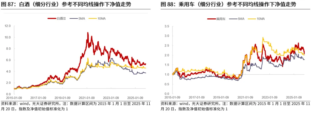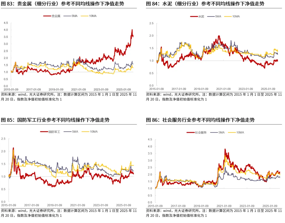 此外,军工、社会服务、贵金属、白酒等行业也不适用,这可能与近几年股价波动率下降有关。对于军工、社会服务、贵金属、白酒等行业而言,其在2015年以来的股价年化波动率整体并不低,但是均线指标却并没有明显提升投资表现,这可能是因为这些行业近几年股价波动率有所下降,导致均线适用性发生变化,因此参考均线整体投资表现较为一般。