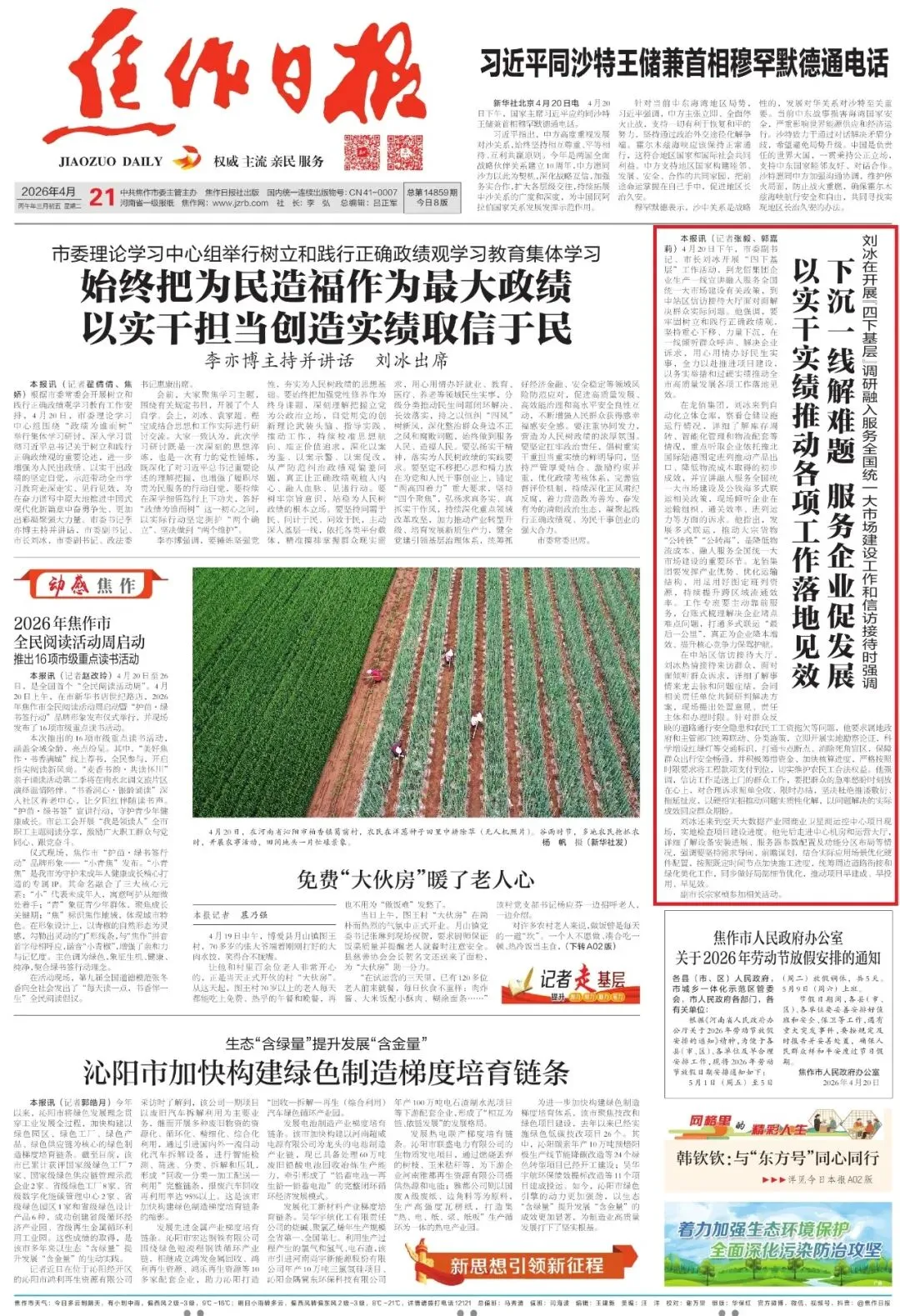 2026年4月21日《焦作日报》A01版