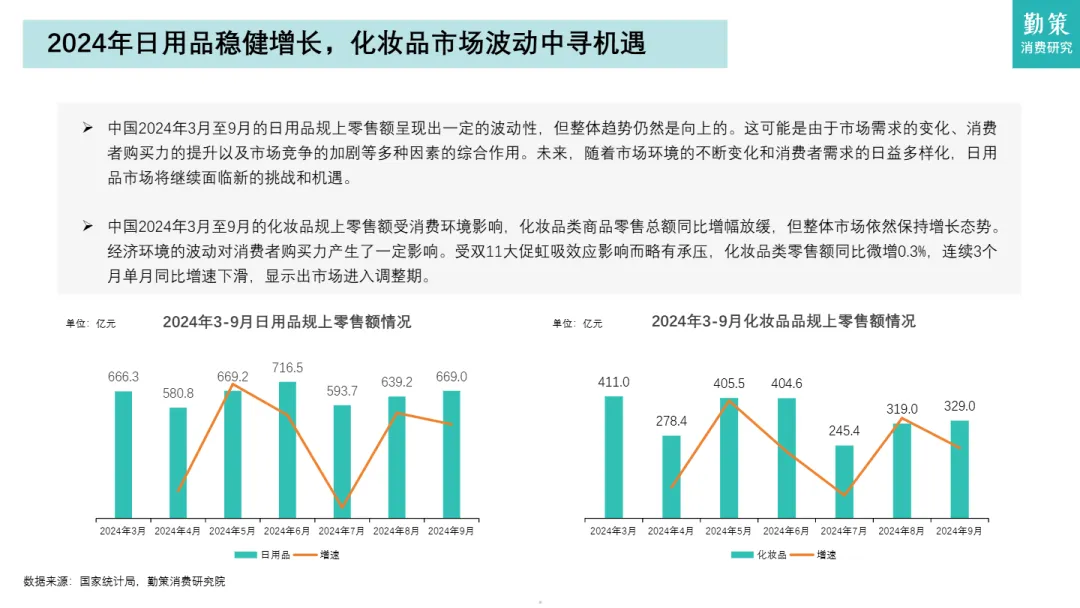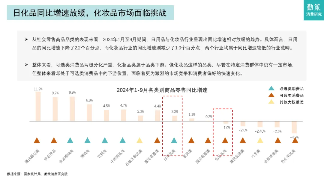 • 日化品类整体增速放缓,化妆品市场承压明显:2024年1-9月,日用品零售同比增速下降2.2个百分点,化妆品仅微增0.3%,连续3个月单月增速下滑,受消费环境疲软与双11虹吸效应影响,行业进入调整期。